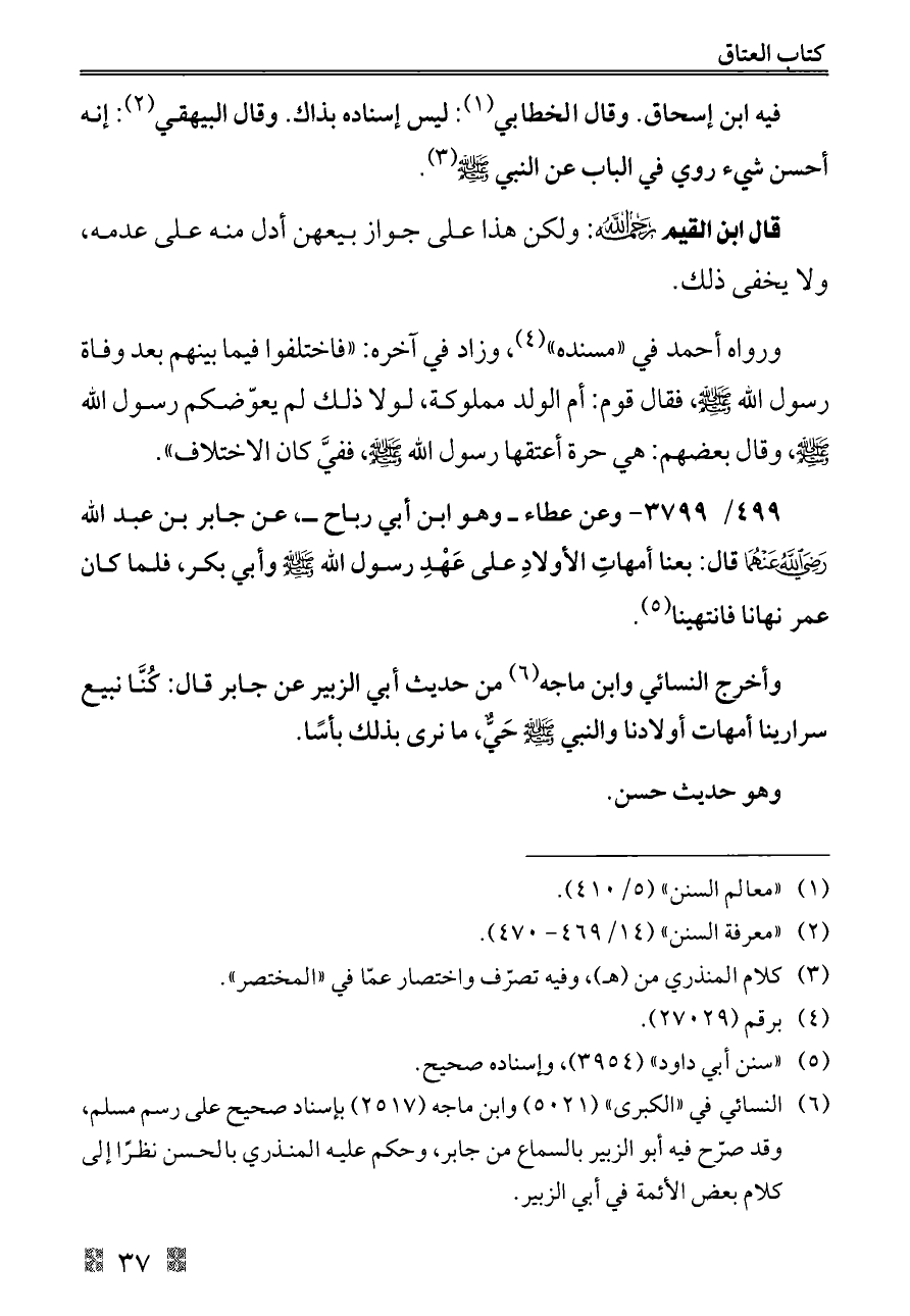 ٤٩٩/ ٣٧٩٩ - وعن عطاء ــ وهو ابن أبي رباح ــ، عن جابر بن عبد الله - رضي الله عنهما - قال: بعنا أمهاتِ الأولادِ على عَهْدِ رسول الله - صلى الله عليه وسلم - وأبي بكر، فلما كان عمر نهانا فانتهينا (¬٥).