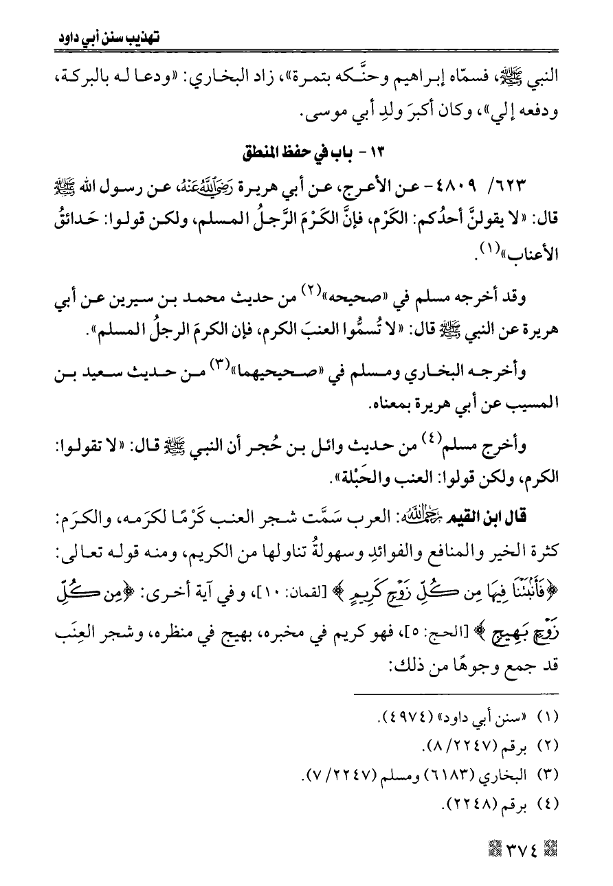 ٦٢٣/ ٤٨٠٩ - عن الأعرج، عن أبي هريرة - رضي الله عنه -، عن رسول الله - صلى الله عليه وسلم - قال: «لا يقولنَّ أحدُكم: الكَرْم، فإنَّ الكَرْمَ الرَّجلُ المسلم، ولكن قولوا: حَدائقُ الأعناب» (¬١).