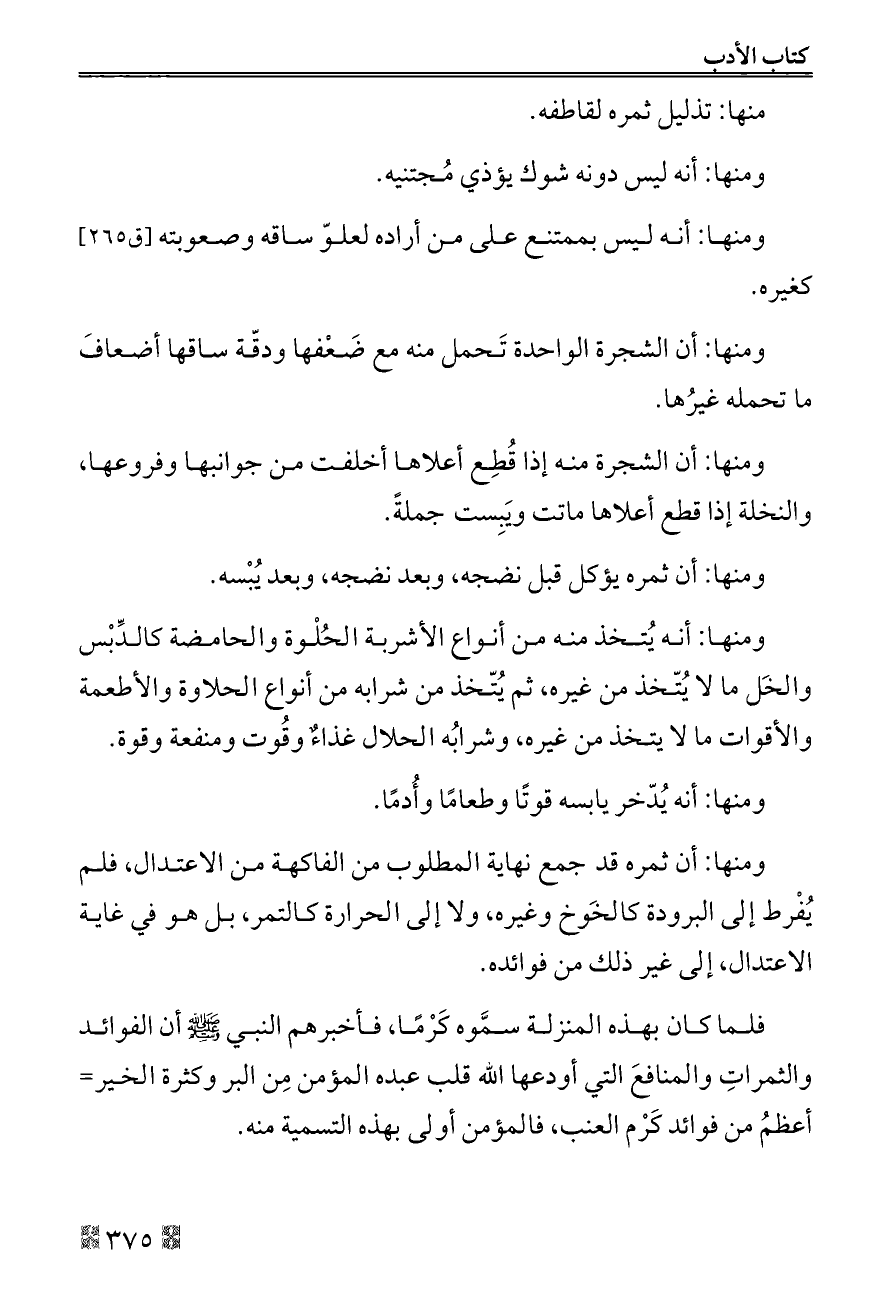ومنها: أن ثمره قد جمع نهاية المطلوب من الفاكهة من الاعتدال، فلم يُفْرط إلى البرودة كالخَوخ وغيره، ولا إلى الحرارة كالتمر، بل هو في غاية الاعتدال، إلى غير ذلك من فوائده.