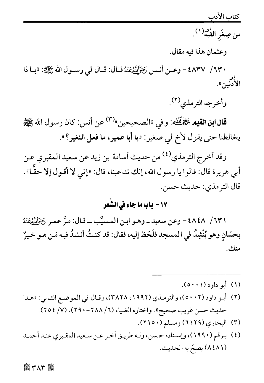 قال ابن القيم - رحمه الله -: وفي «الصحيحين» (¬٣) عن أنس: كان رسول الله - صلى الله عليه وسلم - يخالطنا حتى يقول لأخ لي صغير: «يا أبا عمير، ما فعل النغير؟».