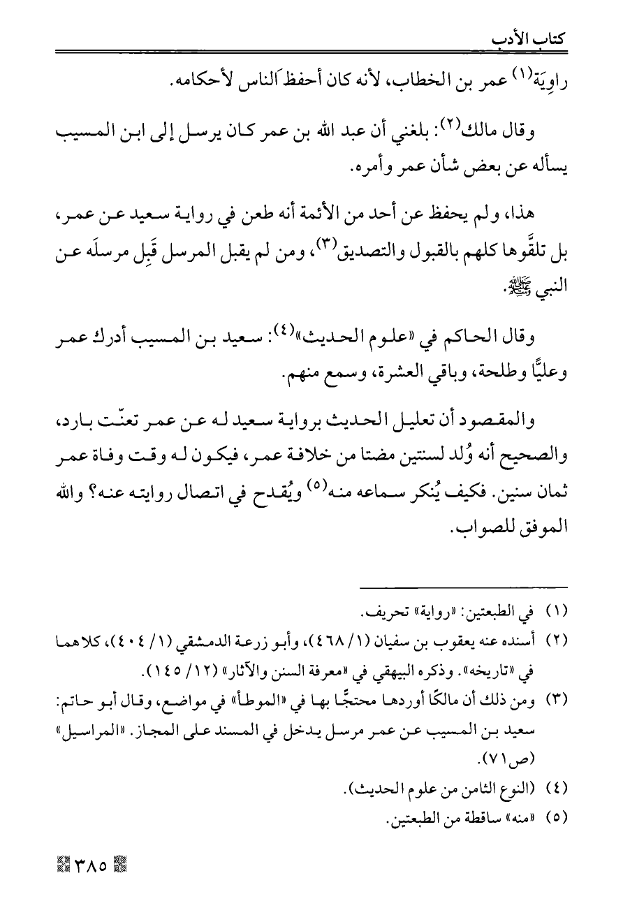 (¬٣) ومن ذلك أن مالكًا أوردها محتجًّا بها في «الموطأ» في مواضع، وقال أبو حاتم: سعيد بن المسيب عن عمر مرسل يدخل في المسند على المجاز. «المراسيل» (ص ٧١).