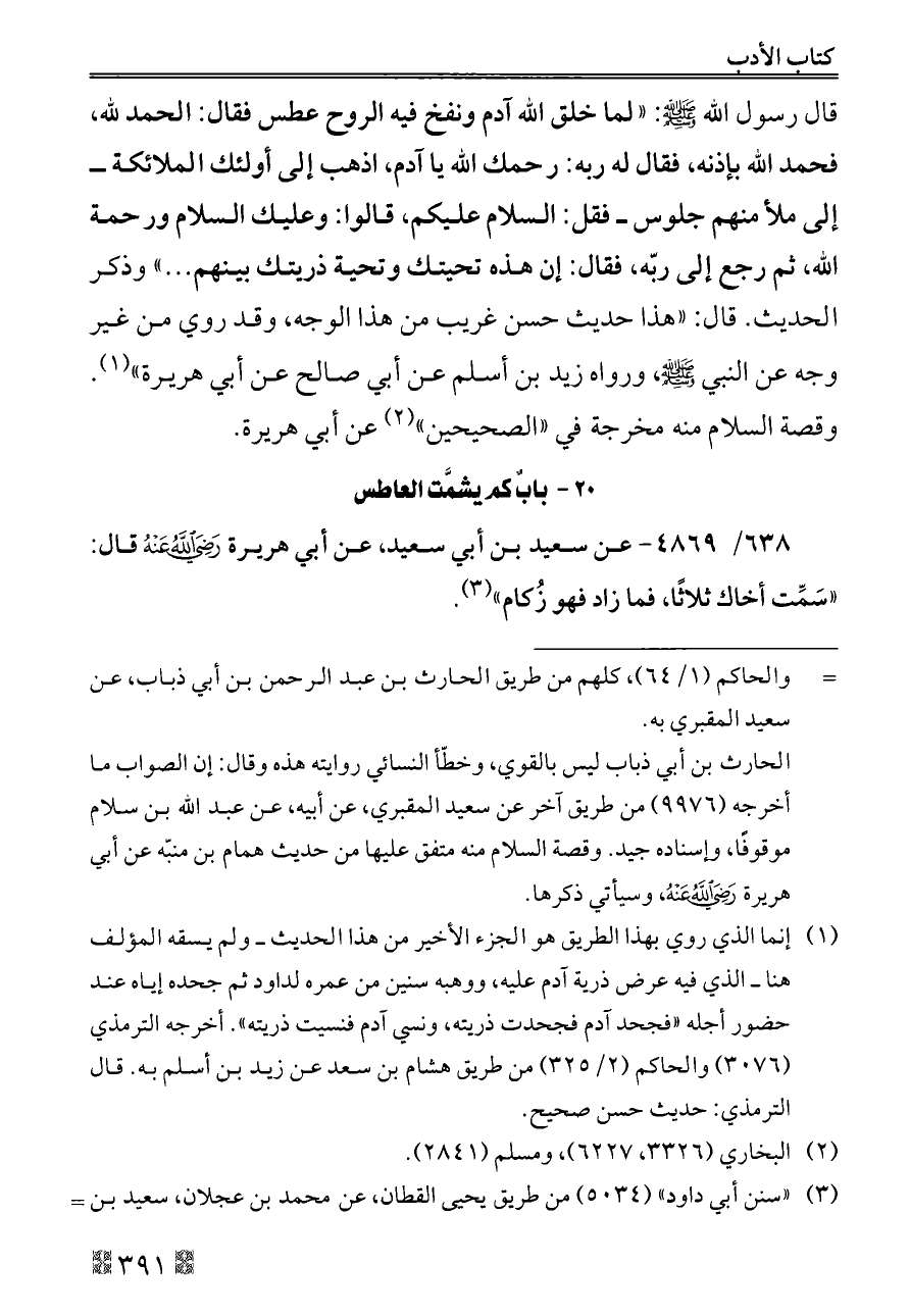 ٦٣٨/ ٤٨٦٩ - عن سعيد بن أبي سعيد، عن أبي هريرة - رضي الله عنه - قال: «سَمِّت أخاك ثلاثًا، فما زاد فهو زُكام» (¬٣).