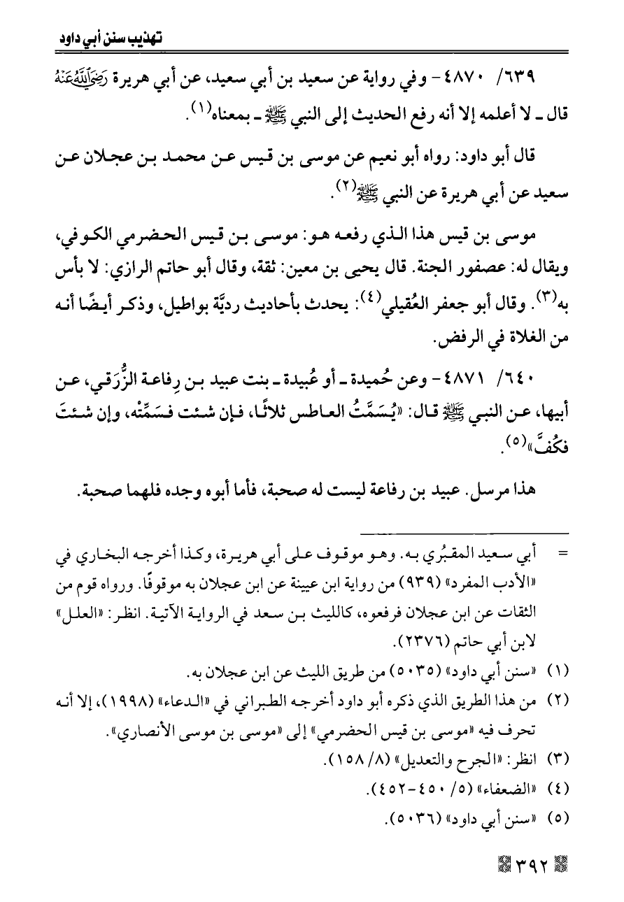 قال أبو داود: رواه أبو نعيم عن موسى بن قيس عن محمد بن عجلان عن سعيد عن أبي هريرة عن النبي - صلى الله عليه وسلم - (¬٢).