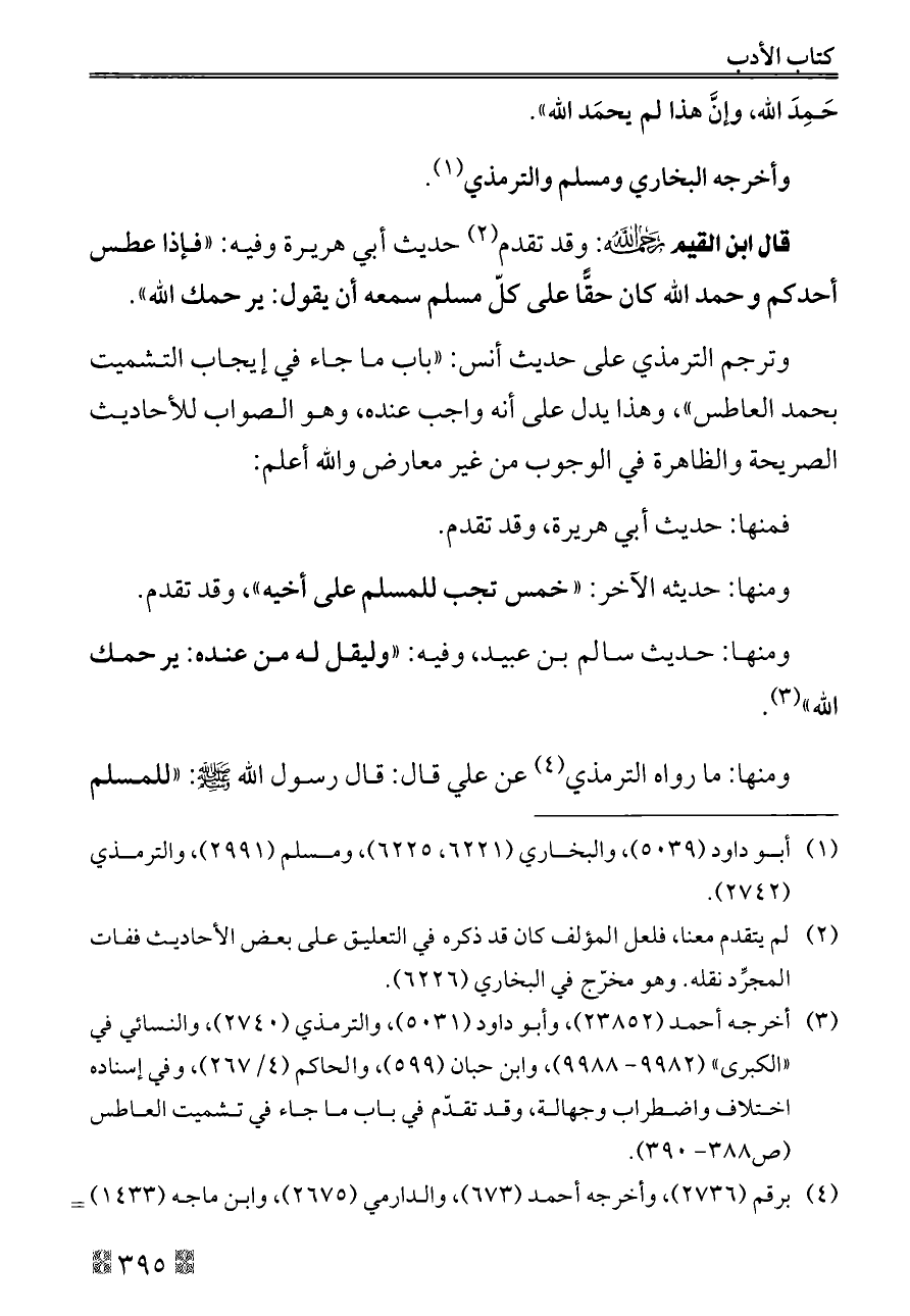 قال ابن القيم - رحمه الله -: وقد تقدم (¬٢) حديث أبي هريرة وفيه: «فإذا عطس أحدكم وحمد الله كان حقًّا على كلّ مسلم سمعه أن يقول: يرحمك الله».