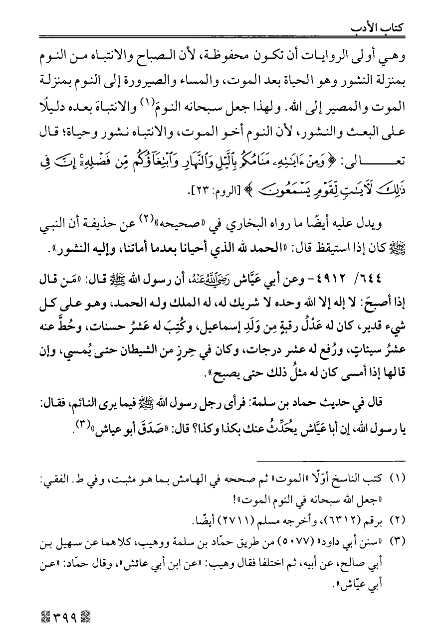 ويدل عليه أيضًا ما رواه البخاري في «صحيحه» (¬٢) عن حذيفة أن النبي - صلى الله عليه وسلم - كان إذا استيقظ قال: «الحمد لله الذي أحيانا بعدما أماتنا، وإليه النشور».
