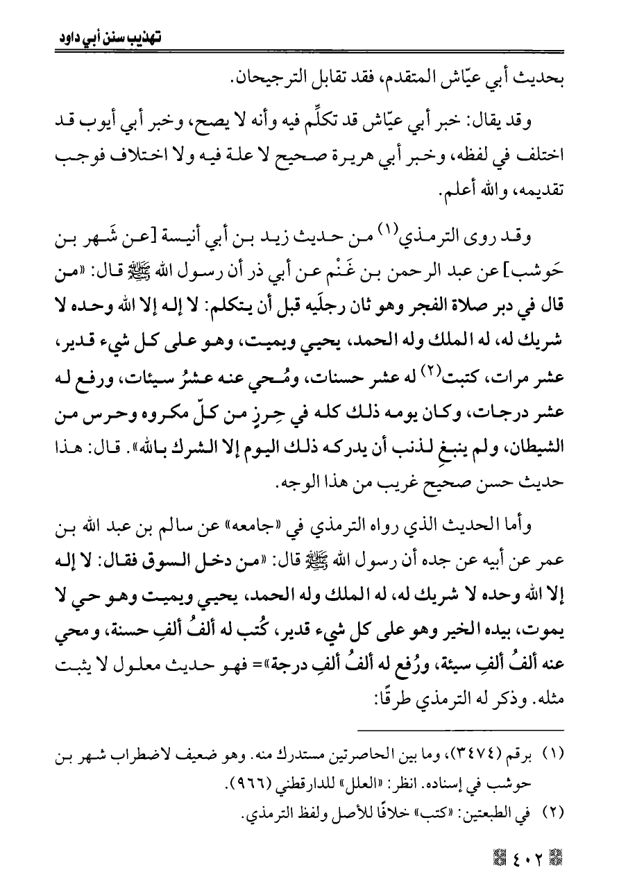 وقد روى الترمذي (¬١) من حديث زيد بن أبي أنيسة [عن شَهر بن حَوشب] عن عبد الرحمن بن غَنْم عن أبي ذر أن رسول الله - صلى الله عليه وسلم - قال: «من قال في دبر صلاة الفجر وهو ثان رجلَيه قبل أن يتكلم: لا إله إلا الله وحده لا شريك له، له الملك وله الحمد، يحيي ويميت، وهو على كل شيء قدير، عشر مرات، كتبت (¬٢) له عشر حسنات، ومُحي عنه عشرُ سيئات، ورفع له عشر درجات، وكان يومه ذلك كله في حِرزٍ من كلّ مكروه وحرس من الشيطان، ولم ينبغِ لذنب أن يدركه ذلك اليوم إلا الشرك بالله». قال: هذا حديث حسن صحيح غريب من هذا الوجه.