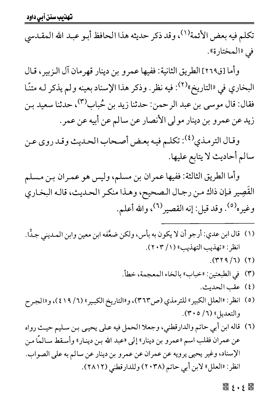 (¬٦) قاله ابن أبي حاتم والدارقطني، وجعلا الحمل فيه على يحيى بن سليم حيث رواه عن عمران فقلب اسم «عمرو بن دينار» إلى «عبد الله بن دينار» وأسقط سالمًا من الإسناد، وغير يحيى يرويه عن عمران عن عمرو بن دينار عن سالم به على الصواب. انظر: «العلل» لابن أبي حاتم (٢٠٣٨) وللدارقطني (٢٨١٢).