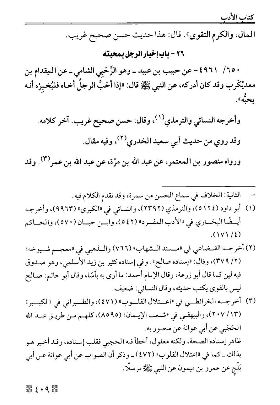 ٦٥٠/ ٤٩٦١ - عن حبيب بن عبيد ــ وهو الرَّحَبِي الشامي ــ عن المِقدام بن معديْكَرب وقد كان أدركه، عن النبي - صلى الله عليه وسلم - قال: «إذا أحَبَّ الرجلُ أخاه فليُخبِرْه أنه يحبُّه».