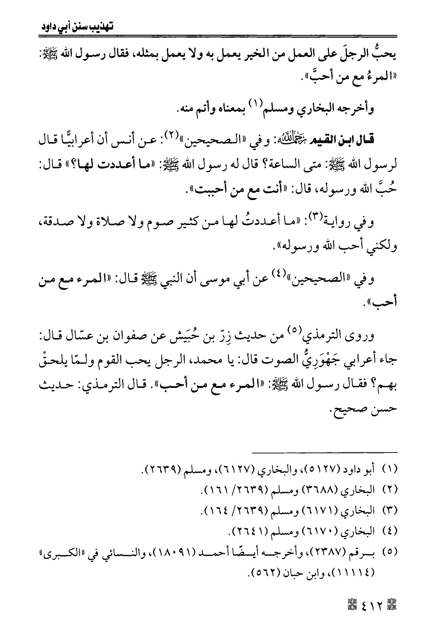 قال ابن القيم - رحمه الله -: وفي «الصحيحين» (¬٢): عن أنس أن أعرابيًّا قال لرسول الله - صلى الله عليه وسلم -: متى الساعة؟ قال له رسول الله - صلى الله عليه وسلم -: «ما أعددت لها؟» قال: حُبَّ الله ورسوله، قال: «أنت مع من أحببت».