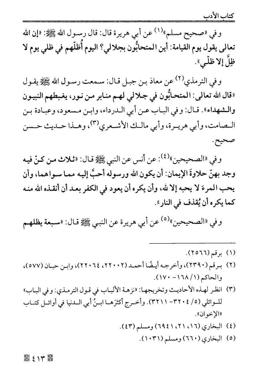 (¬٣) انظر لهذه الأحاديث وتخريجها: «نزهة الألباب في قول الترمذي: وفي الباب» للوائلي (٥/ ٣٢٠٤ - ٣٢١١). وأخرج أكثرَها ابنُ أبي الدنيا في أوائل كتاب «الإخوان».