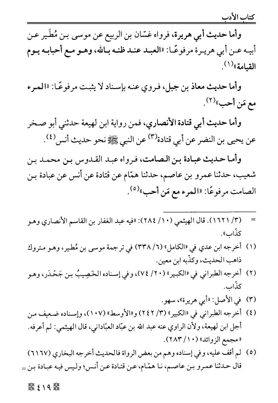 وأما حديث عبادة بن الصامت، فرواه عبد القدوس بن محمد بن شعيب، حدثنا عمرو بن عاصم، حدثنا همّام عن قتادة عن أنس عن عبادة بن الصامت مرفوعًا: «المرء مع مَن أحب» (¬٥).