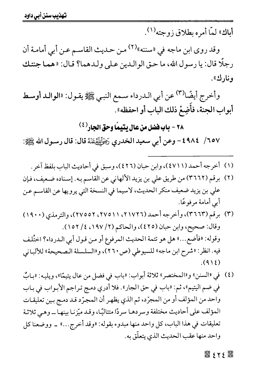 (¬٤) في «السنن» و «المختصر» ثلاثة أبواب: «باب في فضل من عال يتيمًا»، ويليه: «بابٌ في ضم اليتيم»، ثم: «باب في حق الجار». فلا أدري دمج تراجم الأبواب في باب واحد من المؤلف أو من المجرّد، ثم الذي يظهر أن المجرّد قد دمج بين تعليقات المؤلف على أحاديث مختلفة وسردها سردًا متتاليًا، وقد ميّزنا بينها ــ وهي ثلاثة تعليقات في هذا الباب، كل واحد منها مبدوء بقوله: «وقد أخرج ... » ــ ووضعنا كل واحد منها عقب الحديث الذي يتعلّق به.