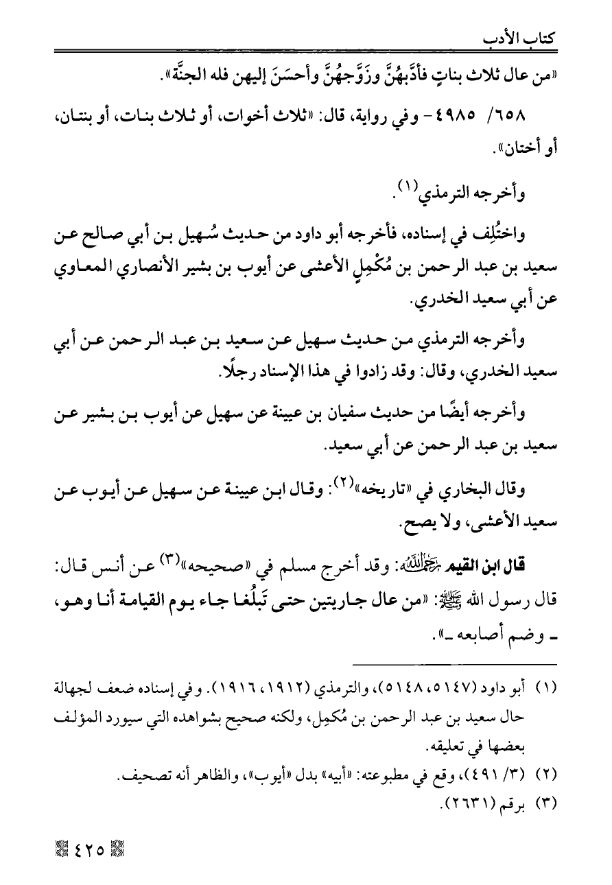 قال ابن القيم - رحمه الله -: وقد أخرج مسلم في «صحيحه» (¬٣) عن أنس قال: قال رسول الله - صلى الله عليه وسلم -: «من عال جاريتين حتى تَبلُغا جاء يوم القيامة أنا وهو، ــ وضم أصابعه ــ».