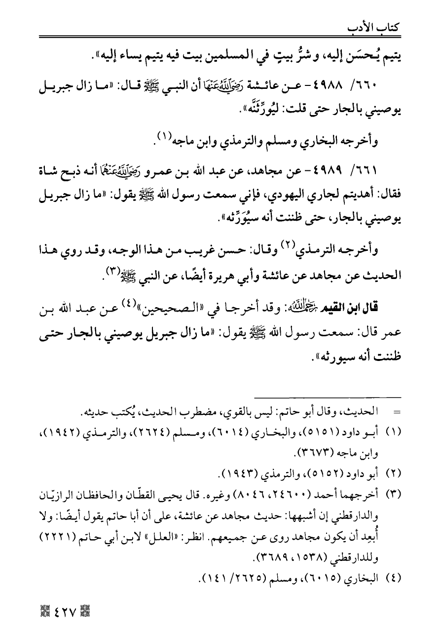 ٦٦٠/ ٤٩٨٨ - عن عائشة - رضي الله عنها - أن النبي - صلى الله عليه وسلم - قال: «ما زال جبريل يوصيني بالجار حتى قلت: ليُورِّثَنَّه».