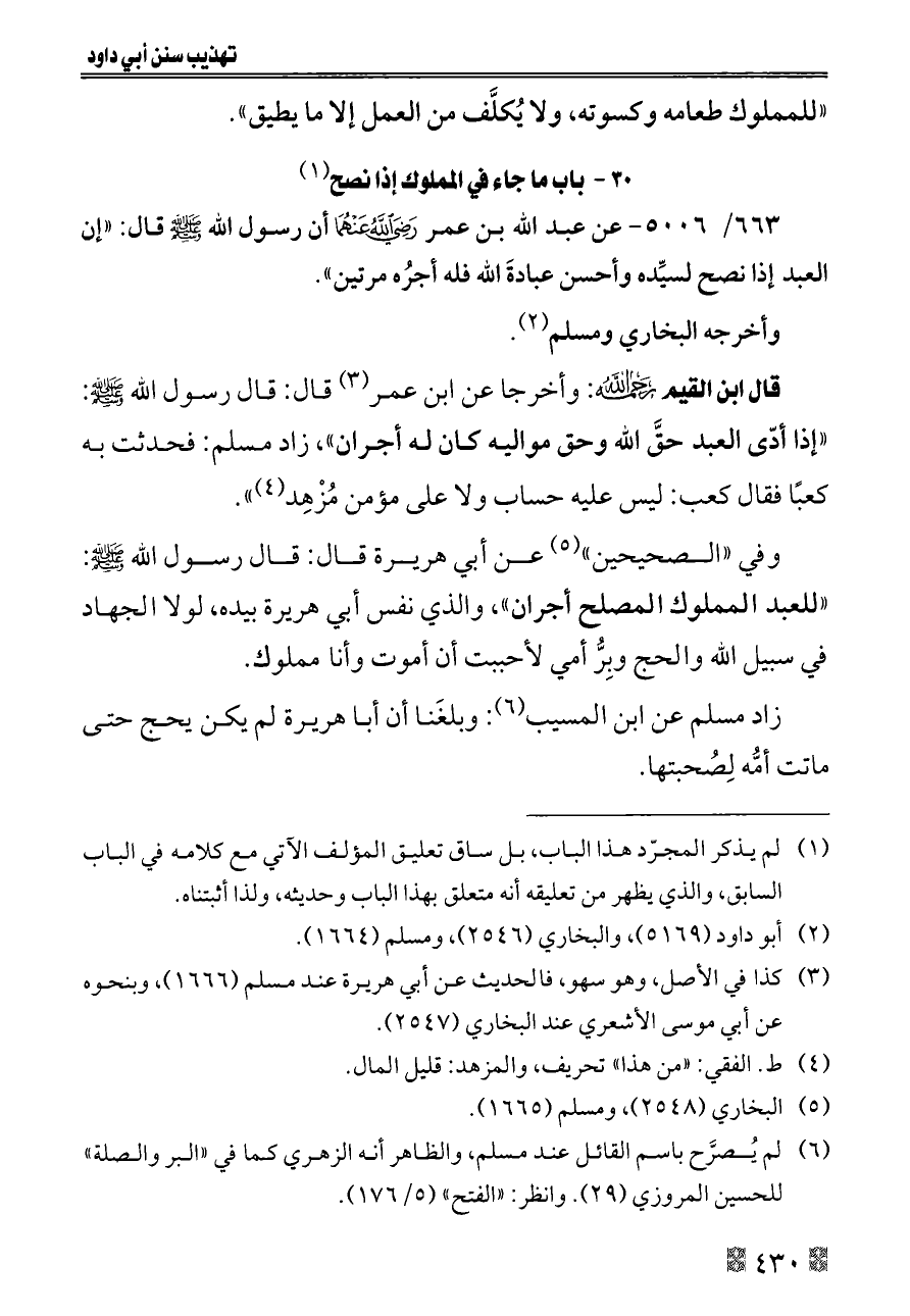٦٦٣/ ٥٠٠٦ - عن عبد الله بن عمر - رضي الله عنهما - أن رسول الله - صلى الله عليه وسلم - قال: «إن العبد إذا نصح لسيِّده وأحسن عبادةَ الله فله أجرُه مرتين».