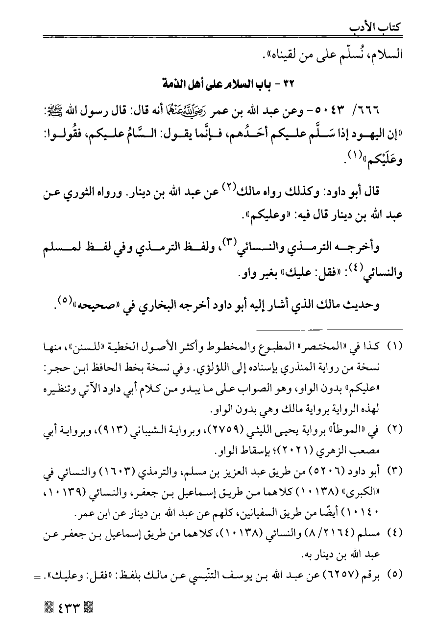 ٦٦٦/ ٥٠٤٣ - وعن عبد الله بن عمر - رضي الله عنهما - أنه قال: قال رسول الله - صلى الله عليه وسلم -: «إن اليهود إذا سَلَّم عليكم أحَدُهم، فإنَّما يقول: السَّامُ عليكم، فقُولوا: وعَلَيْكم» (¬١).