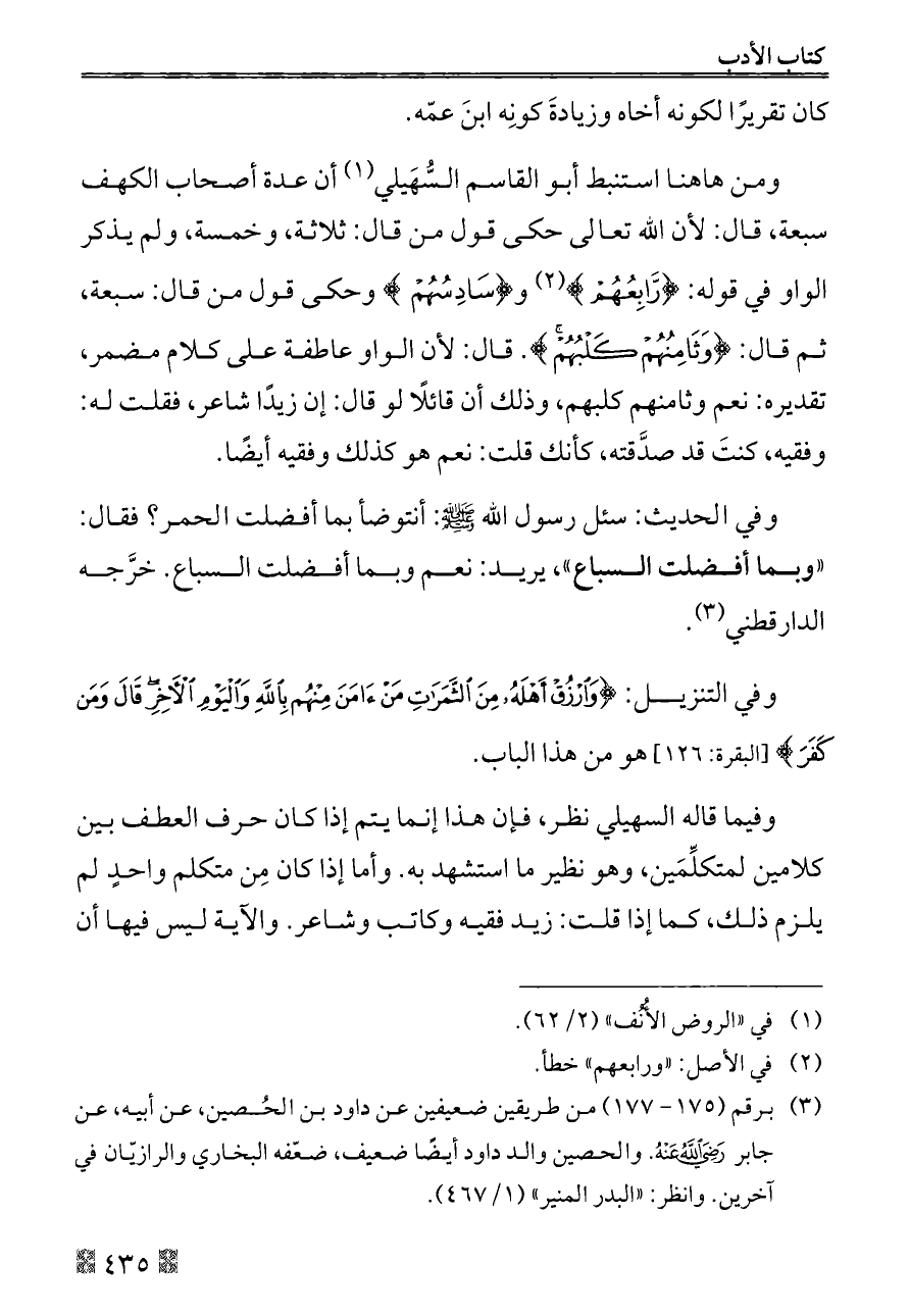 ومن هاهنا استنبط أبو القاسم السُّهَيلي (¬١) أن عدة أصحاب الكهف سبعة، قال: لأن الله تعالى حكى قول من قال: ثلاثة، وخمسة، ولم يذكر الواو في قوله: {رَابِعُهُمْ} (¬٢) و {سَادِسُهُمْ} وحكى قول من قال: سبعة، ثم قال: {وَثَامِنُهُمْ كَلْبُهُمْ}. قال: لأن الواو عاطفة على كلام مضمر، تقديره: نعم وثامنهم كلبهم، وذلك أن قائلًا لو قال: إن زيدًا شاعر، فقلت له: وفقيه، كنتَ قد صدَّقته، كأنك قلت: نعم هو كذلك وفقيه أيضًا.