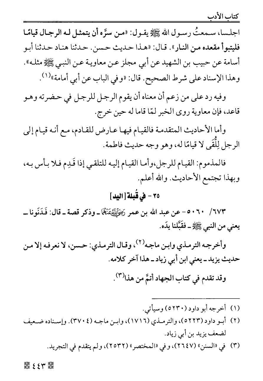 اجلسا، سمعتُ رسول الله - صلى الله عليه وسلم - يقول: «من سرَّه أن يتمثل له الرجال قيامًا فليتبوأ مقعده من النار». قال: «هذا حديث حسن. حدثنا هناد حدثنا أبو أسامة عن حبيب بن الشهيد عن أبي مجلز عن معاوية عن النبي - صلى الله عليه وسلم - مثله». وهذا الإسناد على شرط الصحيح. قال: «وفي الباب عن أبي أمامة» (¬١).