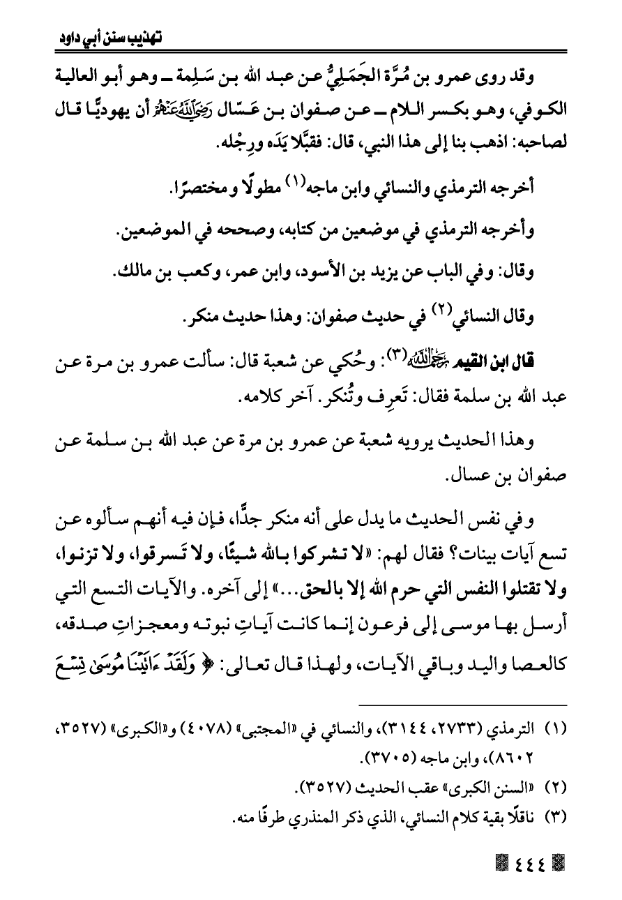 وفي نفس الحديث ما يدل على أنه منكر جدًّا، فإن فيه أنهم سألوه عن تسع آيات بينات؟ فقال لهم: «لا تشركوا بالله شيئًا، ولا تَسرقوا، ولا تزنوا، ولا تقتلوا النفس التي حرم الله إلا بالحق ... » إلى آخره. والآيات التسع التي أرسل بها موسى إلى فرعون إنما كانت آياتِ نبوته ومعجزاتِ صدقه، كالعصا واليد وباقي الآيات، ولهذا قال تعالى: {وَلَقَدْ آتَيْنَا مُوسَى تِسْعَ