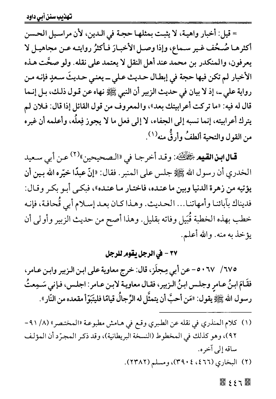 ٦٧٥/ ٥٠٦٧ - عن أبي مِجلَز، قال: خرج معاوية على ابن الزبير وابن عامر، فقَامَ ابنُ عامرٍ وجلس ابنُ الزبير، فقال معاوية لابن عامر: اجلس، فإني سَمِعتُ رسول الله - صلى الله عليه وسلم - يقول: «مَن أحبَّ أن يتمثَّل له الرِّجالُ قيامًا فليتَبَوّأ مقعده من النّار».
