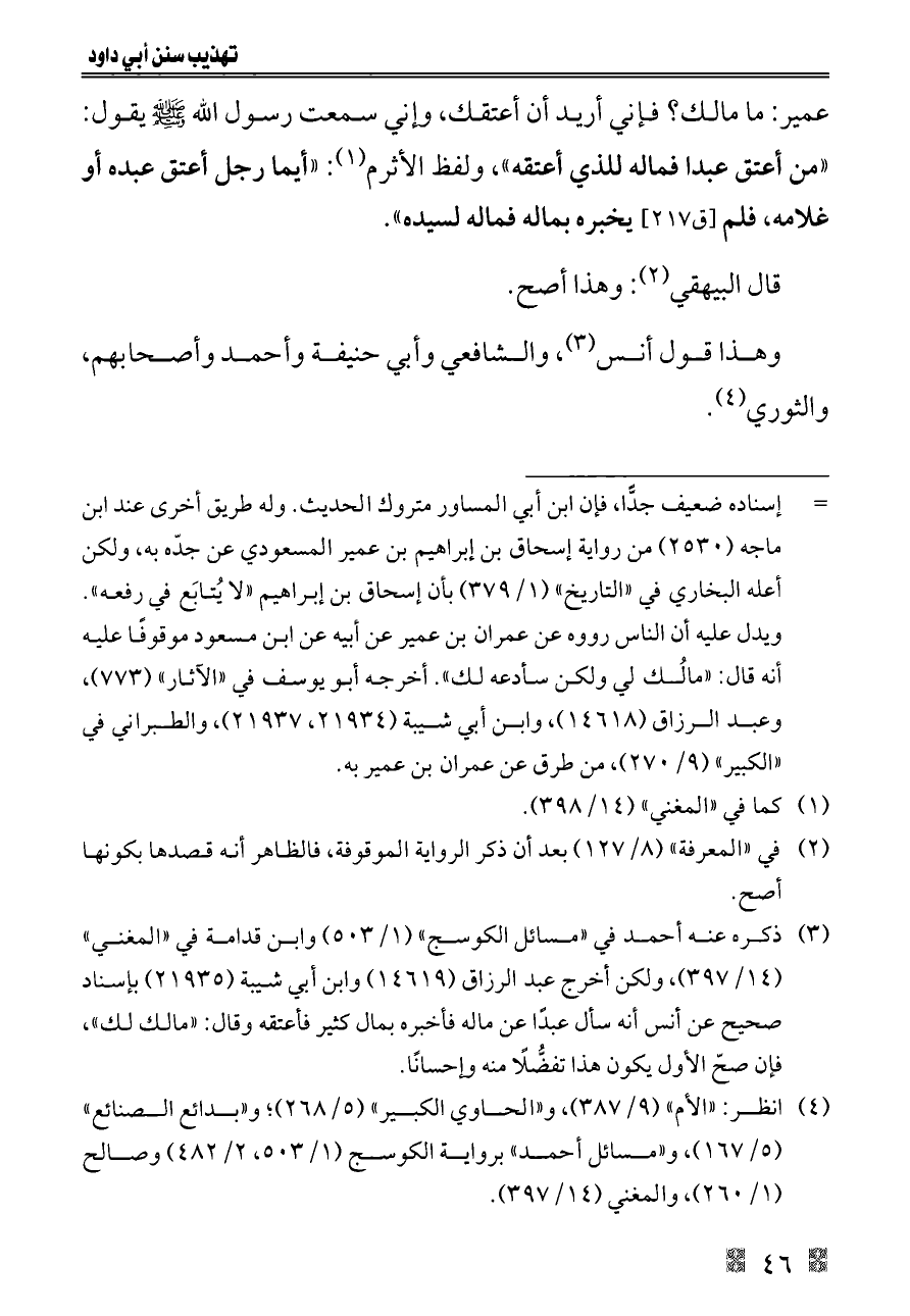 (¬٣) ذكره عنه أحمد في «مسائل الكوسج» (١/ ٥٠٣) وابن قدامة في «المغني» (١٤/ ٣٩٧)، ولكن أخرج عبد الرزاق (١٤٦١٩) وابن أبي شيبة (٢١٩٣٥) بإسناد صحيح عن أنس أنه سأل عبدًا عن ماله فأخبره بمال كثير فأعتقه وقال: «مالك لك»، فإن صحّ الأول يكون هذا تفضُّلًا منه وإحسانًا.