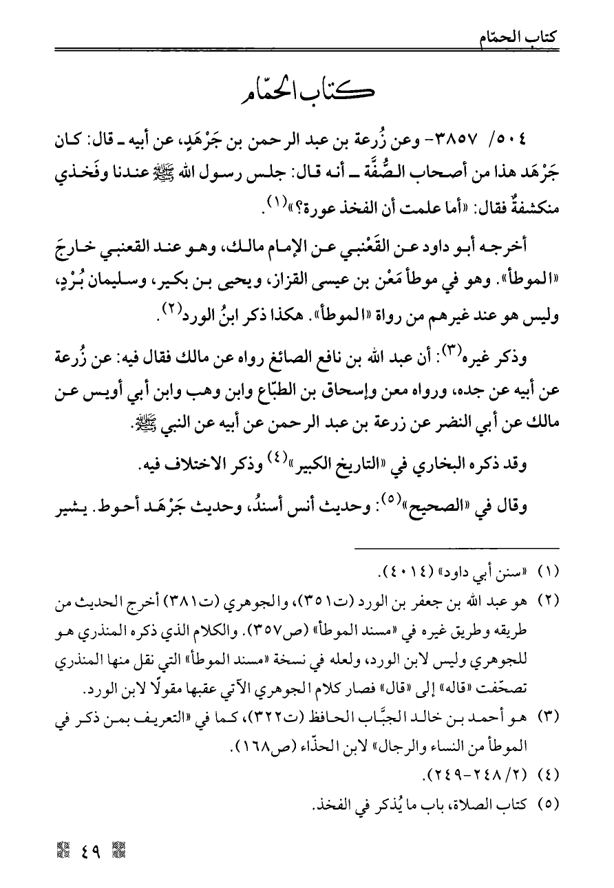 ٥٠٤/ ٣٨٥٧ - وعن زُرعة بن عبد الرحمن بن جَرْهَدٍ، عن أبيه ــ قال: كان جَرْهَد هذا من أصحاب الصُّفَّة ــ أنه قال: جلس رسول الله - صلى الله عليه وسلم - عندنا وفَخذي منكشفةٌ فقال: «أما علمت أن الفخذ عورة؟» (¬١).