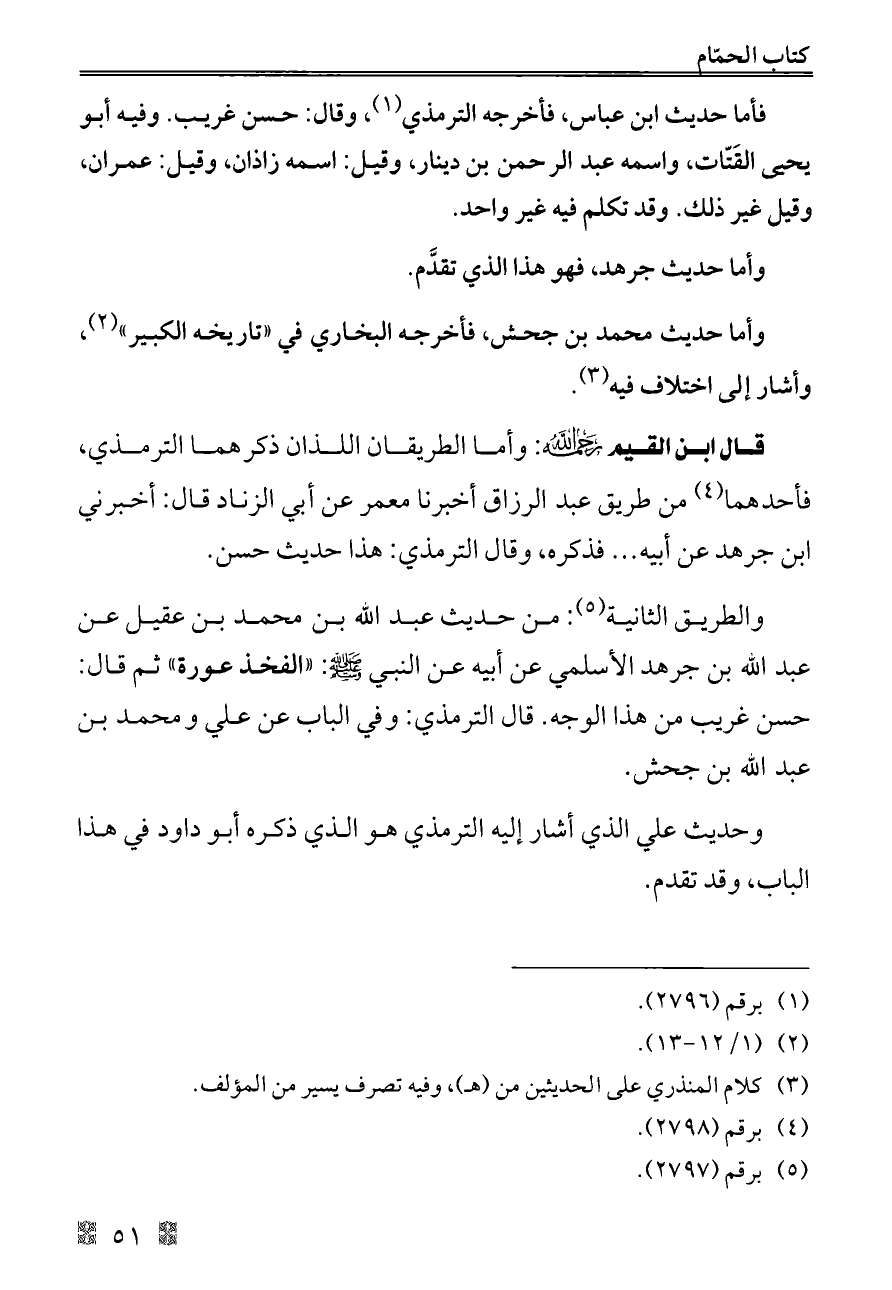 قال ابن القيم - رحمه الله -: وأما الطريقان اللذان ذكرهما الترمذي، فأحدهما (¬٤) من طريق عبد الرزاق أخبرنا معمر عن أبي الزناد قال: أخبرني ابن جرهد عن أبيه ... فذكره، وقال الترمذي: هذا حديث حسن.