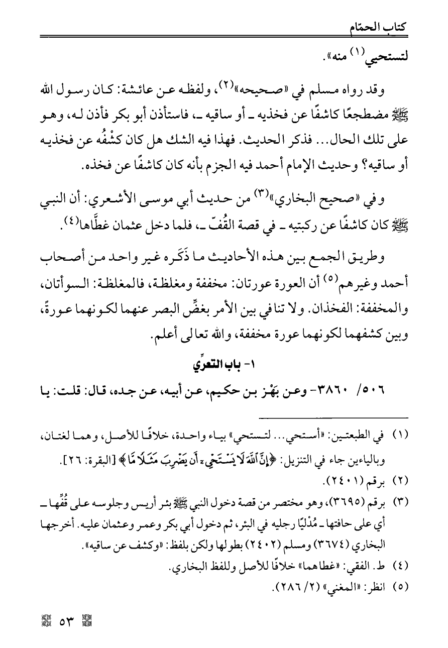وطريق الجمع بين هذه الأحاديث ما ذَكَره غير واحد من أصحاب أحمد وغيرهم (¬٥) أن العورة عورتان: مخففة ومغلظة، فالمغلظة: السوأتان، والمخففة: الفخذان. ولا تنافي بين الأمر بغضِّ البصر عنهما لكونهما عورةً، وبين كشفهما لكونهما عورة مخففة، والله تعالى أعلم.