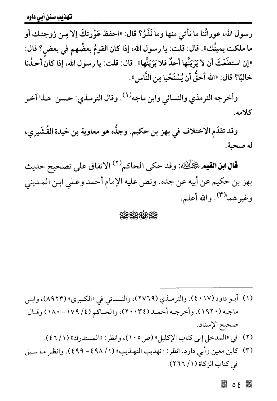 رسول الله، عوراتُنا ما نأتي منها وما نَذَرُ؟ قال: «احفظ عَوْرتكَ إلا مِن زوجتك أو ما ملكت يمينُك». قال: قلت: يا رسول الله، إذا كان القومُ بعضُهم في بعضٍ؟ قال: «إن استطَعْتَ أن لا يَرَيَنَّها أحدٌ فلا يَرَيَنَّها». قال: قلت: يا رسول الله، إذا كان أحدُنا خاليًا؟ قال: «الله أحقُّ أن يُسْتَحْيا مِن النَّاس».