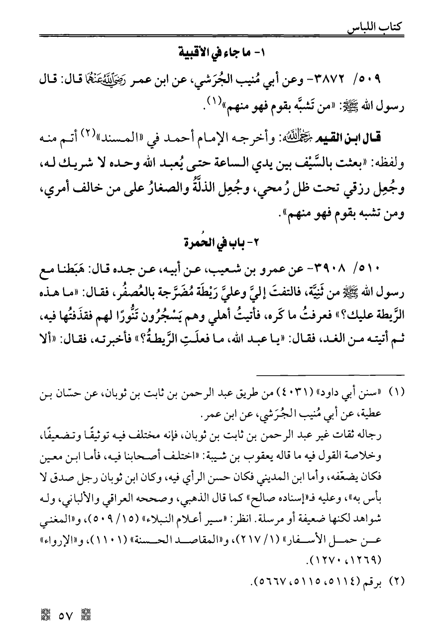٥٠٩/ ٣٨٧٢ - وعن أبي مُنيب الجُرَشي، عن ابن عمر - رضي الله عنهما - قال: قال رسول الله - صلى الله عليه وسلم -: «من تَشبَّه بقوم فهو منهم» (¬١).