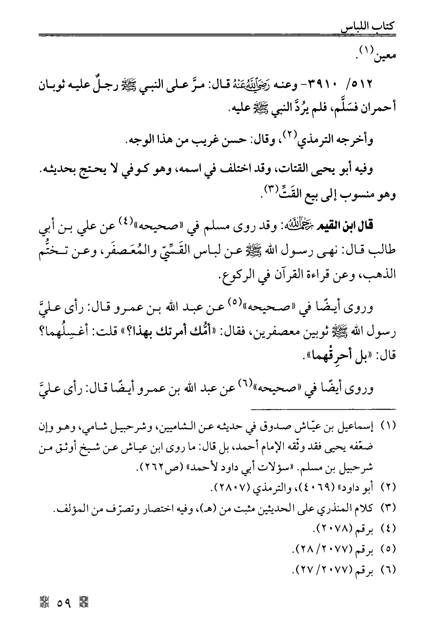 ٥١٢/ ٣٩١٠ - وعنه - رضي الله عنه - قال: مرَّ على النبي - صلى الله عليه وسلم - رجلٌ عليه ثوبان أحمران فسَلَّم، فلم يرُدَّ النبي - صلى الله عليه وسلم - عليه.