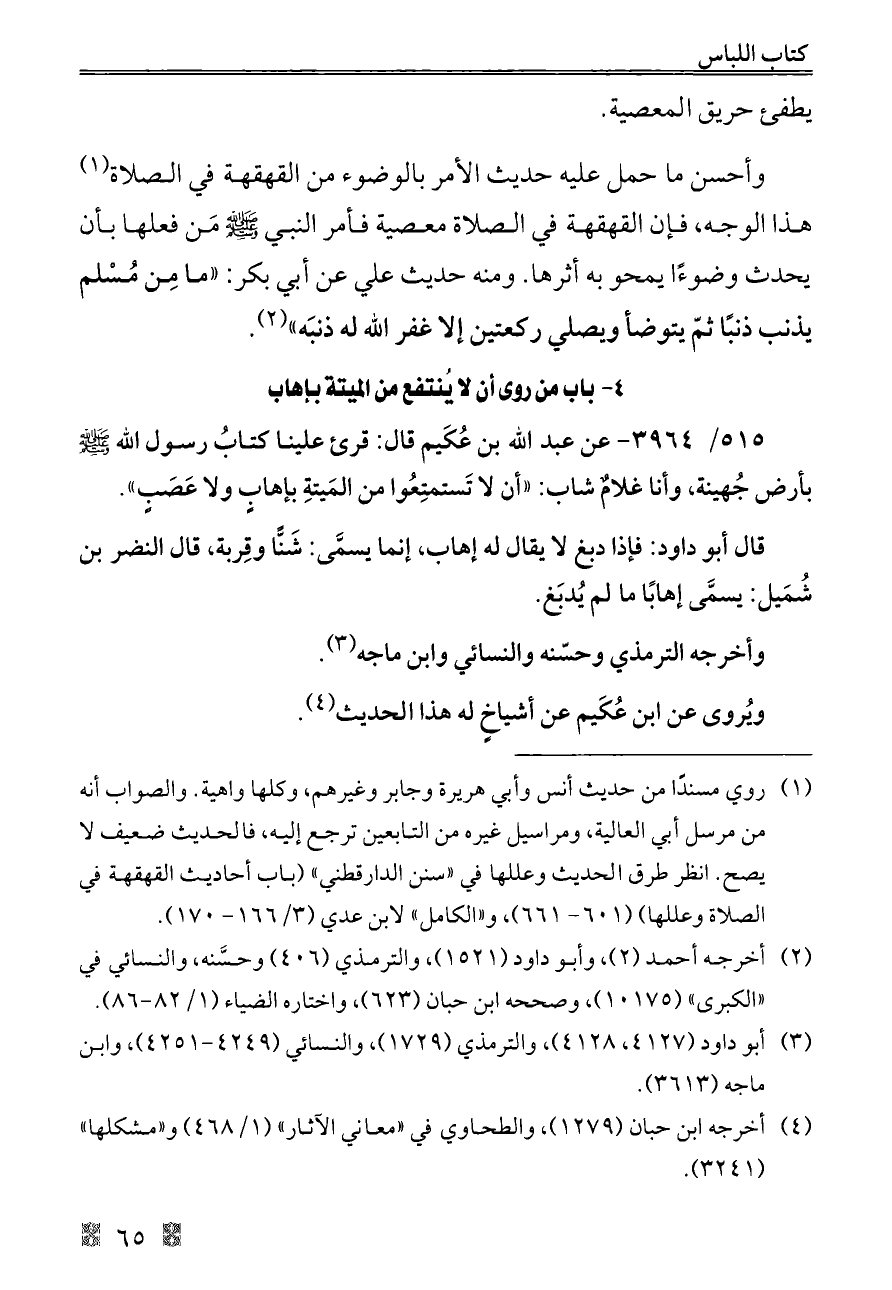 ٥١٥/ ٣٩٦٤ - عن عبد الله بن عُكَيم قال: قرئ علينا كتابُ رسول الله - صلى الله عليه وسلم - بأرض جُهينة، وأنا غلامٌ شاب: «أن لا تَستمتِعُوا من المَيتةِ بإهابٍ ولا عَصَبٍ».