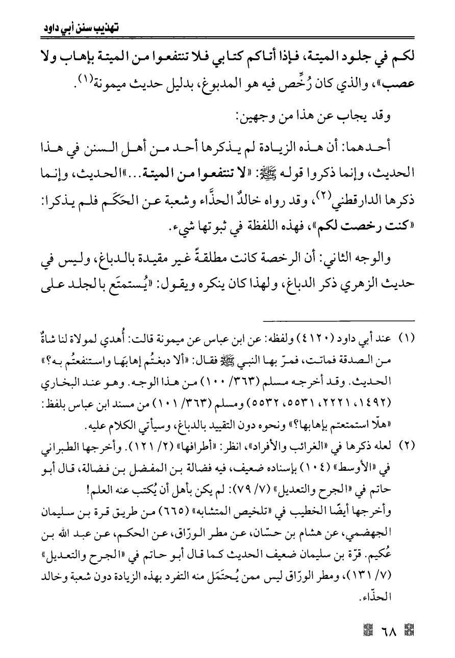 (¬١) عند أبي داود (٤١٢٠) ولفظه: عن ابن عباس عن ميمونة قالت: أُهدي لمولاة لنا شاةٌ من الصدقة فماتت، فمرّ بها النبي - صلى الله عليه وسلم - فقال: «ألا دبغتُم إهابَها واستنفعتُم به؟» الحديث. وقد أخرجه مسلم (٣٦٣/ ١٠٠) من هذا الوجه. وهو عند البخاري (١٤٩٢، ٢٢٢١، ٥٥٣١، ٥٥٣٢) ومسلم (٣٦٣/ ١٠١) من مسند ابن عباس بلفظ: «هلّا استمتعتم بإهابها؟» ونحوه دون التقييد بالدباغ، وسيأتي الكلام عليه.