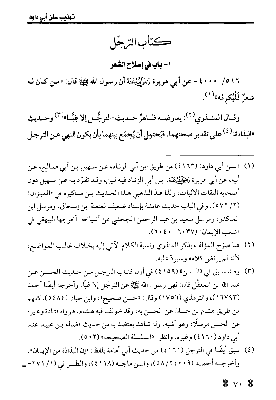 ٥١٦/ ٤٠٠٠ - عن أبي هريرة - رضي الله عنه - أن رسول الله - صلى الله عليه وسلم - قال: «من كان له شعرٌ فَلْيُكرِمْه» (¬١).