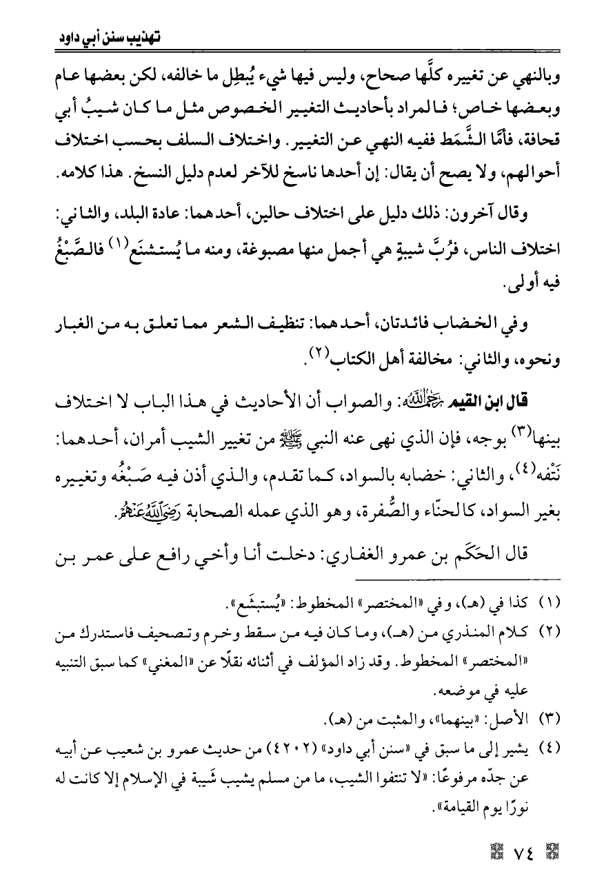 قال ابن القيم - رحمه الله -: والصواب أن الأحاديث في هذا الباب لا اختلاف بينها (¬٣) بوجه، فإن الذي نهى عنه النبي - صلى الله عليه وسلم - من تغيير الشيب أمران، أحدهما: نَتْفه (¬٤)، والثاني: خضابه بالسواد، كما تقدم، والذي أذن فيه صَبْغُه وتغييره بغير السواد، كالحنّاء والصُّفرة، وهو الذي عمله الصحابة - رضي الله عنهم -.
