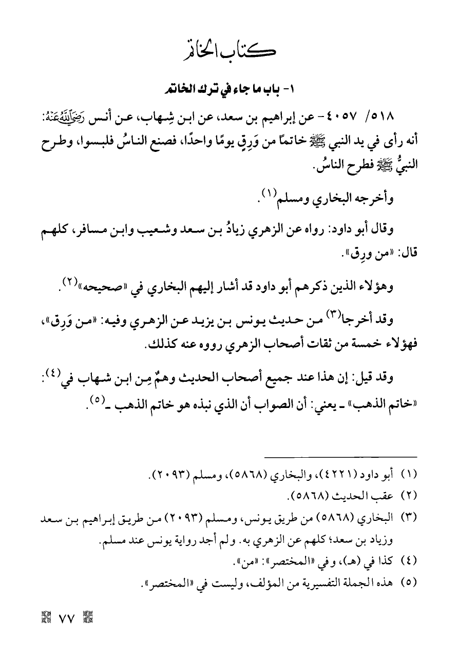 ٥١٨/ ٤٠٥٧ - عن إبراهيم بن سعد، عن ابن شِهاب، عن أنس - رضي الله عنه -: أنه رأى في يد النبي - صلى الله عليه وسلم - خاتمًا من وَرِقٍ يومًا واحدًا، فصنع الناسُ فلبسوا، وطرح النبيُّ - صلى الله عليه وسلم - فطرح الناسُ.
