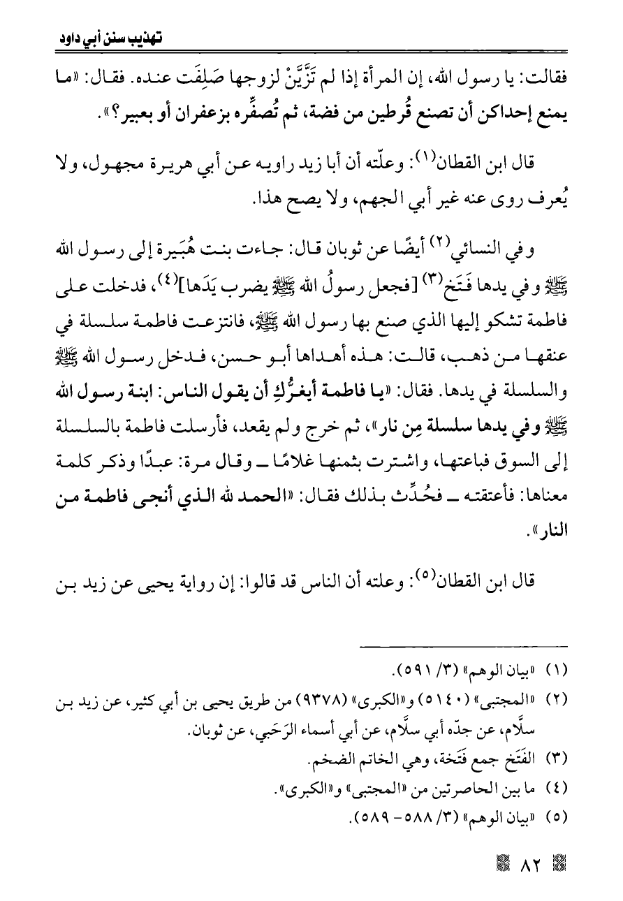 وفي النسائي (¬٢) أيضًا عن ثوبان قال: جاءت بنت هُبَيرة إلى رسول الله - صلى الله عليه وسلم - وفي يدها فَتَخ (¬٣) [فجعل رسولُ الله - صلى الله عليه وسلم - يضرب يَدَها] (¬٤)، فدخلت على فاطمة تشكو إليها الذي صنع بها رسول الله - صلى الله عليه وسلم -، فانتزعت فاطمة سلسلة في عنقها من ذهب، قالت: هذه أهداها أبو حسن، فدخل رسول الله - صلى الله عليه وسلم - والسلسلة في يدها. فقال: «يا فاطمة أيغرُّكِ أن يقول الناس: ابنة رسول الله - صلى الله عليه وسلم - وفي يدها سلسلة مِن نار»، ثم خرج ولم يقعد، فأرسلت فاطمة بالسلسلة إلى السوق فباعتها، واشترت بثمنها غلامًا ــ وقال مرة: عبدًا وذكر كلمة معناها: فأعتقته ــ فحُدِّث بذلك فقال: «الحمد لله الذي أنجى فاطمة من النار».