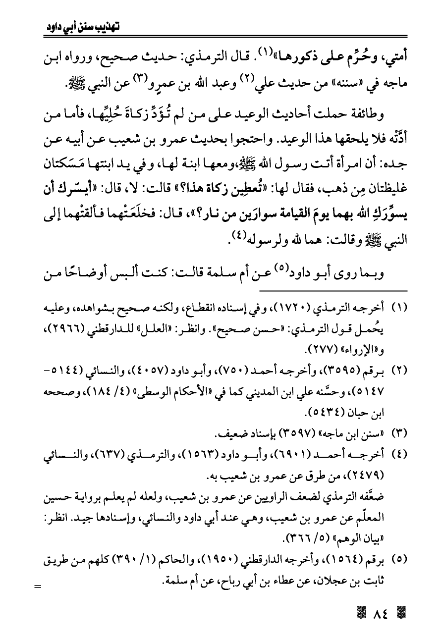 وطائفة حملت أحاديث الوعيد على من لم تُؤَدِّ زكاةَ حُلِيِّها، فأما من أدَّتْه فلا يلحقها هذا الوعيد. واحتجوا بحديث عمرو بن شعيب عن أبيه عن جده: أن امرأة أتت رسول الله - صلى الله عليه وسلم -،ومعها ابنة لها، وفي يد ابنتها مَسَكتان غليظتان مِن ذهب، فقال لها: «تُعطِين زكاة هذا؟» قالت: لا، قال: «أيسّرك أن يسوِّرَكِ الله بهما يومَ القيامة سوارَين من نار؟»، قال: فخلَعَتْهما فألقتْهما إلى النبي - صلى الله عليه وسلم - وقالت: هما لله ولرسوله (¬٤).