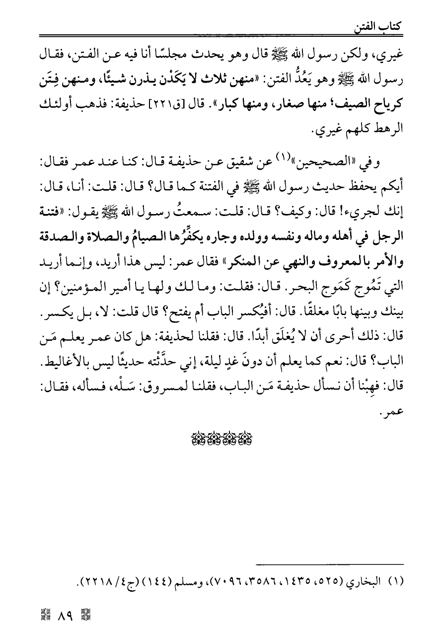 وفي «الصحيحين» (¬١) عن شقيق عن حذيفة قال: كنا عند عمر فقال: أيكم يحفظ حديث رسول الله - صلى الله عليه وسلم - في الفتنة كما قال؟ قال: قلت: أنا، قال: إنك لجريء! قال: وكيف؟ قال: قلت: سمعتُ رسول الله - صلى الله عليه وسلم - يقول: «فتنة الرجل في أهله وماله ونفسه وولده وجاره يكفِّرُها الصيامُ والصلاة والصدقة والأمر بالمعروف والنهي عن المنكر» فقال عمر: ليس هذا أريد، وإنما أريد التي تَمُوج كَمَوج البحر. قال: فقلت: وما لك ولها يا أمير المؤمنين؟ إن بينك وبينها بابًا مغلقًا. قال: أفيُكسر الباب أم يفتح؟ قال قلت: لا، بل يكسر. قال: ذلك أحرى أن لا يُغلَق أبدًا. قال: فقلنا لحذيفة: هل كان عمر يعلم مَن الباب؟ قال: نعم كما يعلم أن دونَ غدٍ ليلة، إني حدَّثْته حديثًا ليس بالأغاليط. قال: فهِبْنا أن نسأل حذيفة مَن الباب، فقلنا لمسروق: سَلْه، فسأله، فقال: عمر.