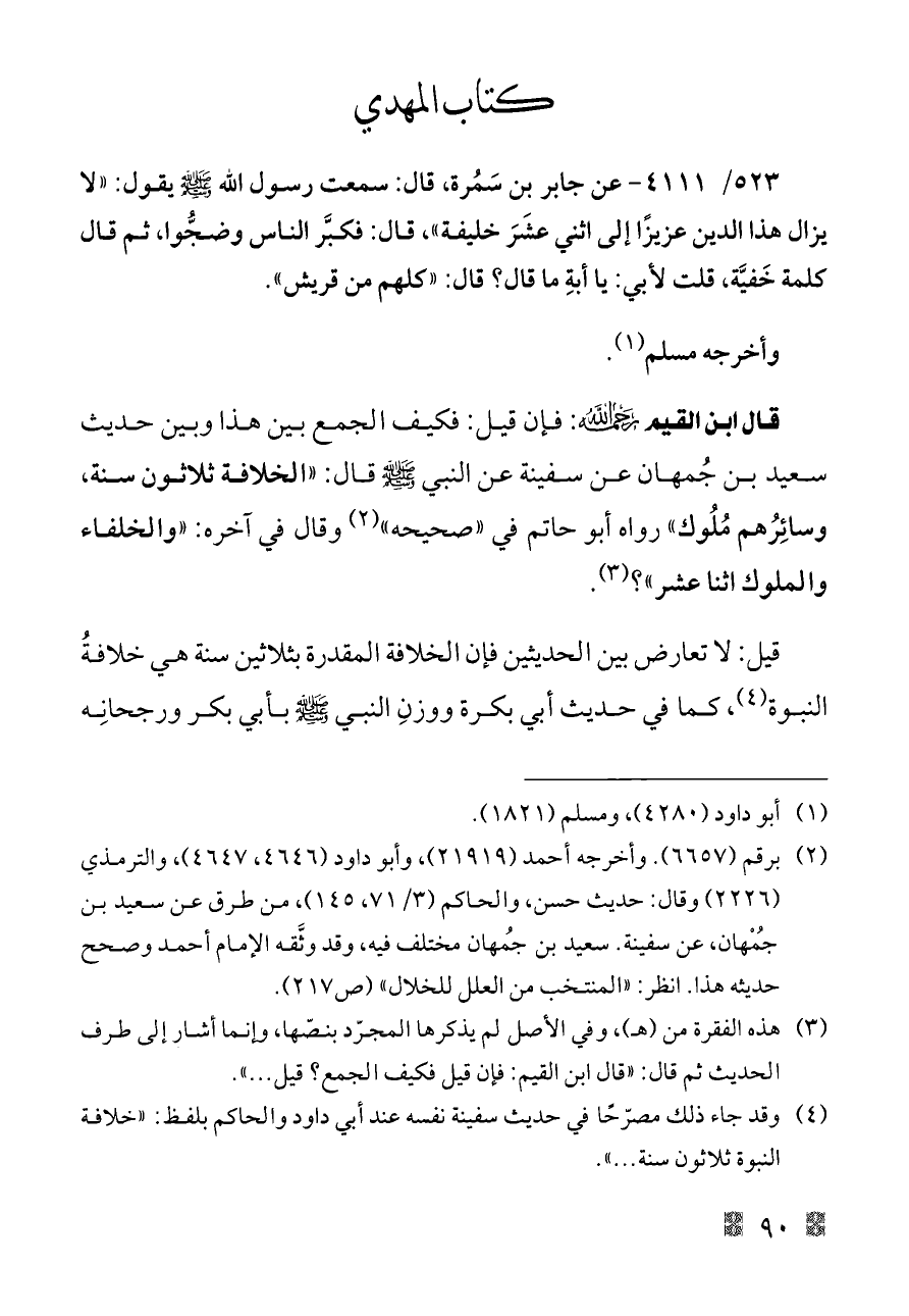 قال ابن القيم - رحمه الله -: فإن قيل: فكيف الجمع بين هذا وبين حديث سعيد بن جُمهان عن سفينة عن النبي - صلى الله عليه وسلم - قال: «الخلافة ثلاثون سنة، وسائِرُهم مُلُوك» رواه أبو حاتم في «صحيحه» (¬٢) وقال في آخره: «والخلفاء والملوك اثنا عشر»؟ (¬٣).