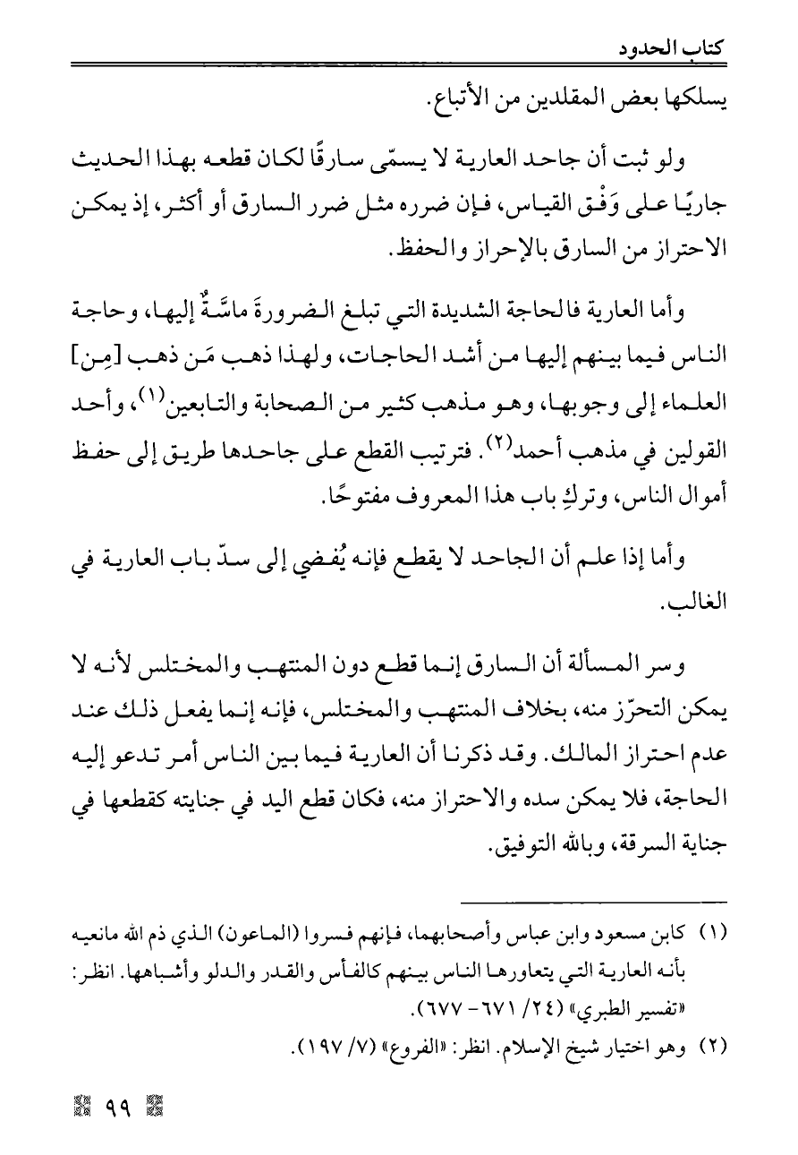 وأما العارية فالحاجة الشديدة التي تبلغ الضرورةَ ماسَّةٌ إليها، وحاجة الناس فيما بينهم إليها من أشد الحاجات، ولهذا ذهب مَن ذهب [مِن] العلماء إلى وجوبها، وهو مذهب كثير من الصحابة والتابعين (¬١)، وأحد القولين في مذهب أحمد (¬٢). فترتيب القطع على جاحدها طريق إلى حفظ أموال الناس، وتركِ باب هذا المعروف مفتوحًا.