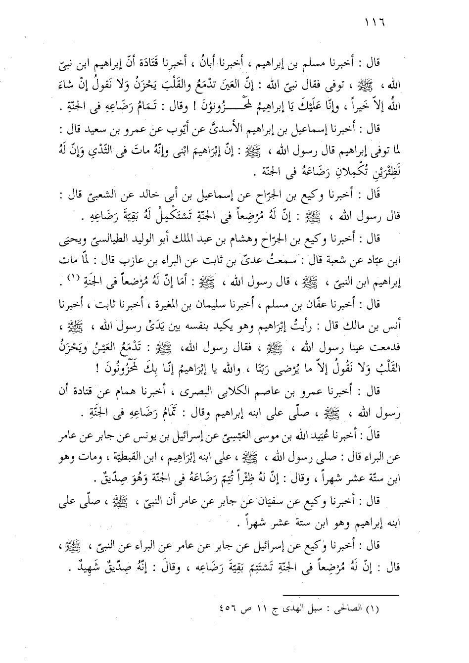 قال: أخبرنا عمرو بن عاصم الكلابى البصرى، أخبرنا همام عن قتادة أن رسول اللَّه، -صلى اللَّه عليه وسلم-، صلّى على ابنه إبراهيم وقال: تَمَامُ رَضَاعِهِ فى الجَنّةِ.