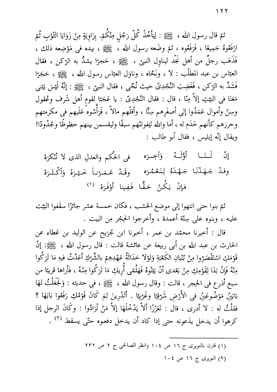 ثمّ قال رسول اللَّه، -صلى اللَّه عليه وسلم-: لِيَأخُذْ كُلّ رَجُلٍ مِنْكُمْ. بِزَاوِيَةٍ مِنْ زَوَايَا الثّوْبِ ثُمّ ارْفَعُوهُ جَمِيعًا، فَرَفَعُوه، ثمّ وضَعه رسول اللَّه، -صلى اللَّه عليه وسلم-، بيده فى مَوْضِعه ذلك، فَذَهَب رجلٌ من أهل نَجْد ليناوِل النبىّ، -صلى اللَّه عليه وسلم- حَجرًا يشدُّ به الرّكن، فقال العبّاس بن عبد المطلّب: لا، ونَحَّاه، وناوَل العبّاس رسول اللَّه، -صلى اللَّه عليه وسلم-، حَجَرًا فَشَدَّ به الرّكن، فَغَضِبَ النَّجْدِىّ حيث نُحِّى، فقال النبىّ، -صلى اللَّه عليه وسلم-: إنّهُ لَيْسَ يَبْنى مَعَنَا فى البَيْتِ إلّا مِنّا، قال: فقال النَّجْدِىّ: يا عَجَبًا لقومٍ أهل شَرف وعُقول وسِنّ وأموال عَمَدُوا إلى أصغَرِهم سِنًّا، وأقلّهم مالًا، فَرَأَّسُوه عَلَيهم فى مكرمتهم وحرزهم كأنهم خَدَم له، أما واللَّه ليَفوتنّهم سبقًا وليقسمن بينهم حظوظًا وجُدُودًا! ويقال إنّه إبليس، فقال أبو طالب:
