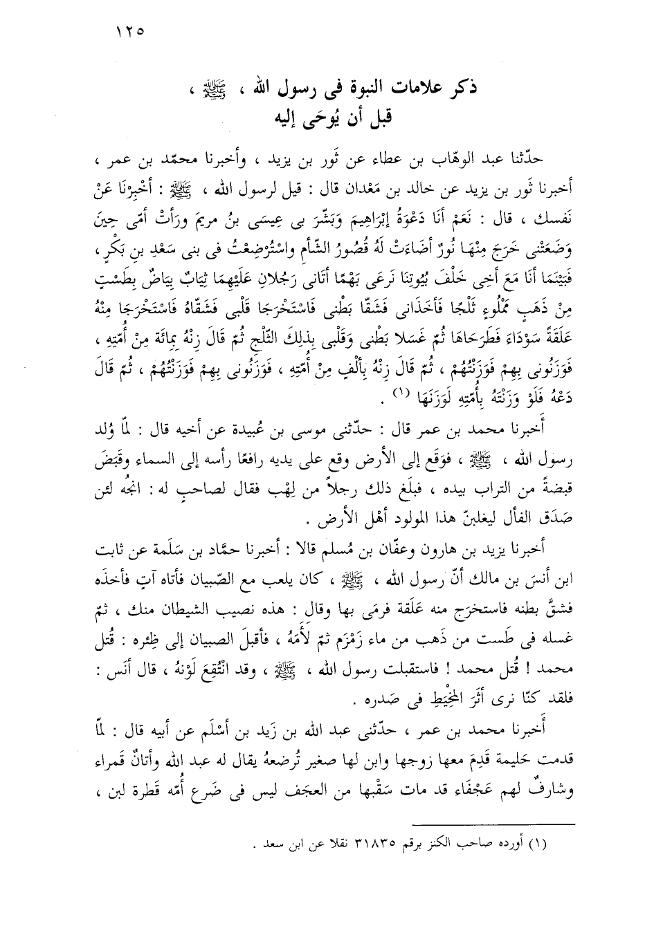 حدّثنا عبد الوهّاب بن عطاء عن ثَور بن يزيد، وأخبرنا محمّد بن عمر، أخبرنا ثَور بن يزيد عن خالد بن مَعْدان قال: قيل رسول اللَّه، -صلى اللَّه عليه وسلم-: أخْبِرْنَا عَنْ نَفسك، قال: نَعَمْ أنَا دَعْوَةُ إبْرَاهِيمَ وَبَشّرَ بى عِيسَى بنُ مريمَ ورَأتْ أمّى حِينَ وَضَعَتْنى خَرَجَ مِنْهَا نورٌ أضَاءَتْ لَهُ قُصُورُ الشّأمِ واسْتُرْضِعْتُ فى بنى سَعْدِ بنِ بَكْرٍ، فَبَيْنَمَا أنَا مَعَ أخِى خَلْفَ بُيُوتِنَا نَرعَى بَهْمًا أتَانى رَجُلانِ عَلَيْهِمَا ثيَابٌ بِيَاضٌ بِطَسْتٍ مِن ذَهَبٍ مَمْلُوءٍ ثَلْجًا فَأخَذَانى فَشَقّا بَطْنى فَاسْتَخْرَجَا قَلْبى فَشَقّاهُ فَاسْتَخْرَجَا مِنْهُ عَلَقَةً سَوْدَاءَ فَطَرَحَاهَا ثُمّ غَسَلا بَطْنى وَقَلْبى بِذلِكَ الثّلْج ثُمّ قَال زِنْهُ بِمِائَة مِنْ أُمّتِهِ، فَوَزَنُونى بِهِمْ فَوَزَنْتُهُمْ، ثُمّ قَالَ زِنْهُ بِألْفٍ مِنْ أُمّتِهِ، فَوَزَنُونى بِهِمْ فَوَزَنْتُهُمْ، ثُمّ قَالَ دَعْهُ فَلَوْ وَزَنْتَهُ بِأُمّتِهِ لَوَزَنَهَا (¬١).