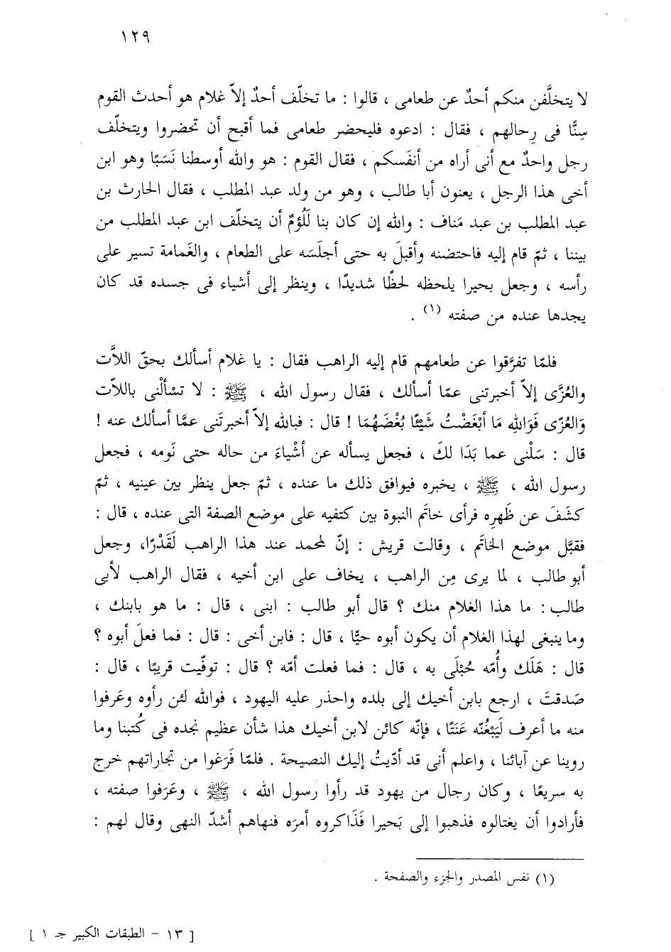لا يتخلَّفن منكم أحدٌ عن طعامى، قالوا: ما تخلّف أحدٌ إلّا غلام هو أحدث القوم سِنًّا فى رِحالهم، فقال: ادعوه فليحضر طعامى فما أقبح أن تحضروا ويتخلّف رجل واحدٌ مع أنى أراه من أنفَسكم، فقال القوم: هو واللَّه أوسطنا نَسَبًا وهو ابن أخى هذا الرجل، يعنون أبا طالب، وهو من ولد عبد المطلب، فقال الحارث بن عبد المطلب بن عبد مَناف: واللَّه إن كان بنا لَلُؤمٌ أن يتخلّف ابن عبد المطلب من بيننا، ثمّ قام إليه فاحتضنه وأقبلَ به حتى أجلَسَه على الطعام، والغَمامة تسير على رأسه، وجعل بحيرا يلحظه لحظًا شديدًا، وينظر إلى أشياء فى جسده قد كان يجدها عنده من صفته (¬١).