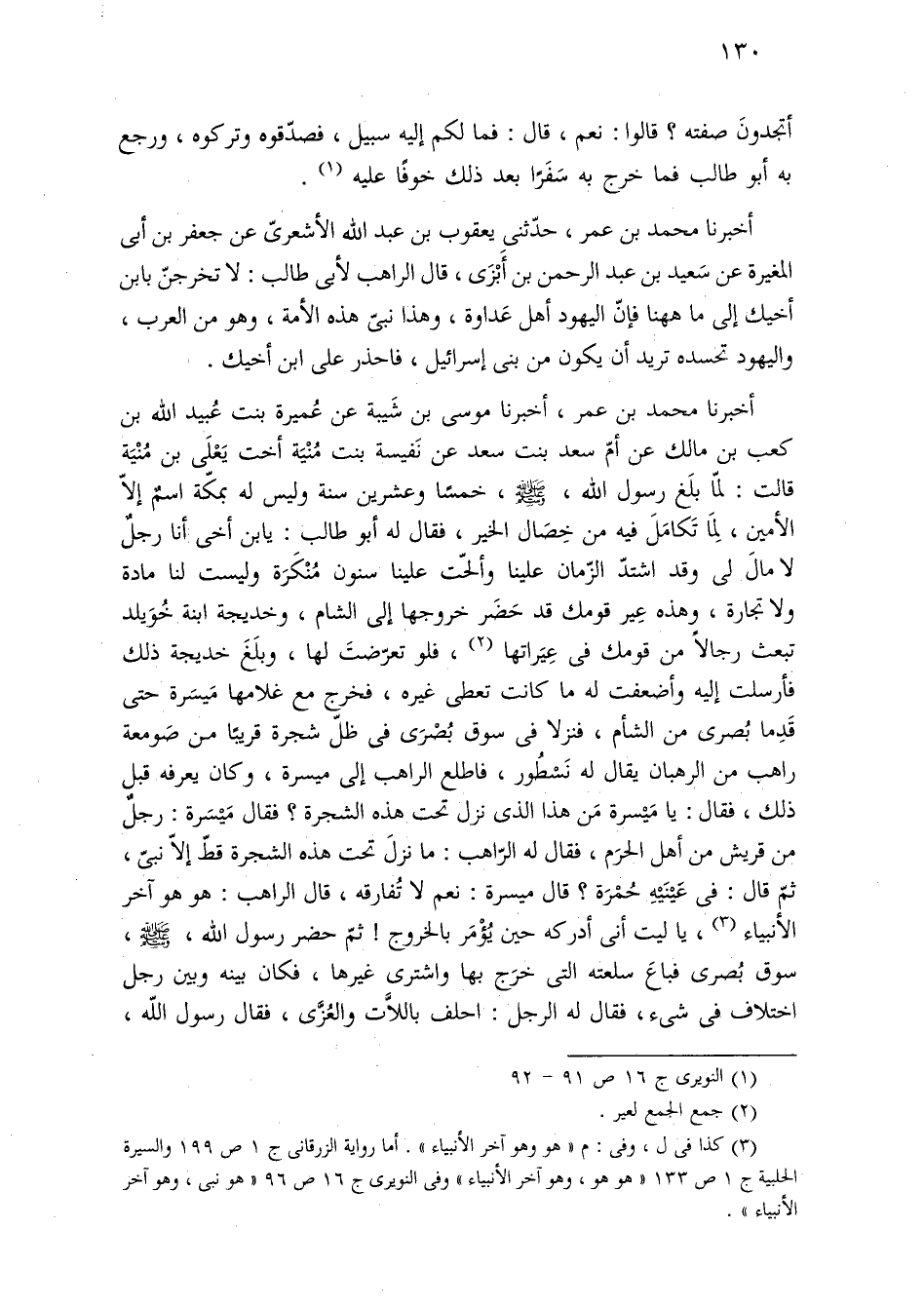 أخبرنا محمد بن عمر، أخبرنا موسى بن شَيبة عن عُميرة بنت عُبيد اللَّه بن كعب بن مالك عن أمّ سعد بنت سعد عن نَفيسة بنت مُنْيَة أخت يَعْلَى بن مُنْيَة قالت: لمّا بلَغ رسول اللَّه، -صلى اللَّه عليه وسلم-، خمسًا وعشرين سنة وليس له بمكّة اسمٌ إلّا الأمين، لِمَا تَكامَلَ فيه من خِصَال الخير، فقال له أبو طالب: يابن أخى أنا رجلٌ لا مالَ لى وقد اشتدّ الزّمان علينا وألحّت علينا سنون مُنْكَرَة وليست لنا مادة ولا تجارة، وهذه عِير قومك قد حَضَر خروجها إلى الشام، وخديجة ابنة خُوَيلد تبعث رجالًا من قومك فى عِيَراتها (¬٢)، فلو تعرّضتَ لها، وبلَغَ خديجة ذلك فأرسلت إليه وأضعفت له ما كانت تعطى غيره، فخرج مع غلامها مَيسَرة حتى قَدِما بُصرى من الشأم، فنزلا فى سوف بُصْرَى فى ظلّ شجرة قريبًا من صَومعة راهب من الرهبان يقال له نَسْطُور، فاطلع الراهب إلى ميسرة، وكان يعرفه قبل ذلك، فقال: يا مَيْسرة مَن هذا الذى نزل تحت هذه الشجرة؟ فقال مَيْسَرة: رجلٌ من قريش من أهل الحرَم، فقال له الرّاهب: ما نزلَ تحت هذه الشجرة قطّ إلّا نبىّ، ثمّ قال: فى عَينَيْهِ حُمْرَة؟ قال ميسرة: نعم لا تُفارقه، قال الراهب: هو هو آخر الأنبياء (¬٣)، يا ليت أنى أدركه حين يُؤْمَر بالخروج! ثمّ حضر رسول اللَّه، -صلى اللَّه عليه وسلم-، سوق بُصرى فباعَ سلعته التى خرَج بها واشترى غيرها، فكان بينه وبين رجل اختلاف فى شئ، فقال له الرجل: احلف باللَّات والعُزَّى، فقال رسول اللَّه،