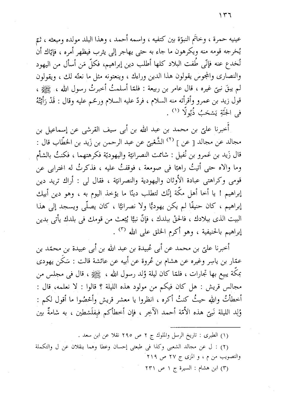 عينيه حمرة، وخاتَم النبوّة بين كتفيه، وإسمه أحمد، وهذا البلد مولده ومبعثه، ثمّ يُخرجه قومه منه ويكرهون ما جاء به حتى يهاجر إلى يثرب فيظهر أمره، فإيّاك أن تُخدع عنه فإنّى طُفت البلاد كلها أطلب دين إبراهيم، فكلّ مَن أسأل من اليهود والنصارى والمجوس يقولون هذا الدين وراءك، وينعتونه مثل ما نعتّه لك، ويقولون لم يبقَ نبىّ غيره، قال عامر بن ربيعة: فلمّا أسلمتُ أخبرتُ رسول اللَّه، -صلى اللَّه عليه وسلم-، قول زيد بن عمرو وأقرأته منه السلام، فردّ عليه السلام ورحّم عليه وقال: قَدْ رَأيْتُهُ فى الجنَّةِ يَسْحَبُ ذُيُولًا (¬١).