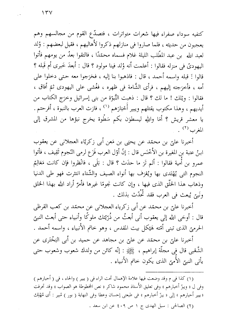 كتفيه سوداء صفراء فيها شعرات متواترات، فتصدّع القوم من مجالسهم وهم يعجبون من حديثه، فلما صاروا فى منازلهم ذكروا لأهاليهم، فقيل لبعضهم: وُلد لعبد اللَّه بن عبد المطّلب الليلة غلام فسماه محمّدًا، فالتقوا بعدُ من يومهم فأتوا اليهودىّ فى منزله فقالوا: أعلمت أنه وُلد فينا مولود؟ قال: أبعدَ خَبرى أم قَبله؟ قالوا: قبله واسمه أحمد، قال: فاذهبوا بنا إليه، فخرَجوا معه حتى دخلوا على أمه، فأخرَجته إليهم، فرأى الشَّامة فى ظهره، فغُشى على اليهودى ثمّ أفاق، فقالوا: ويْلك! ما لك؟ قال: ذهبت النُّبوّة من بنى إسرائيل وخرَج الكتاب من أيديهم، وهذا مكتوب يقتلهم ويبير أَحْبَارَهم (¬١)، فازت العرب بالنبوة، أفرحتم. يا معشر قريش؟ أمَا واللَّهِ ليسطوَن بكم سَطْوة يخرج نبؤها من المشرق إلى المغرب (¬٢).