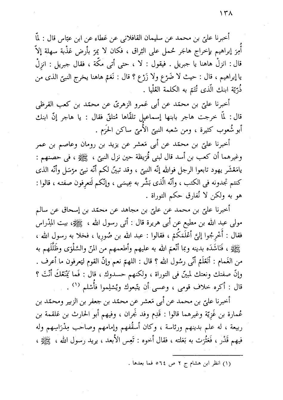 أخبرنا علىّ بن محمد عن علىّ بن مجاهد عن محمّد بن إسحاق عن سالم مولى عبد اللَّه بن مطيع عن أبى هريرة قال: أتى رسول اللَّه، -صلى اللَّه عليه وسلم-، بيت المِدْراس فقال: أَخْرِجُوا إلىَّ أعْلَمَكُمْ، فقالوا: عبد اللَّه بن صُورِيا، فخلا به رسول اللَّه، -صلى اللَّه عليه وسلم-، فَنَاشَدَه بدينه وبما أنْعمَ اللَّه به عليهم وأطعمهم من المنّ والسَّلْوَى وظَلَّلَهم به من الغَمام: أتَعْلَمُ أنّى رسُول اللَّه؟ قال: اللهمّ نعم وإنّ القوم ليَعرفون ما أعرف. وإنّ صفتك ونعتك لمبيّن فى التوراة، ولكنهم حسدوك، قال: فَما يَمْنَعُكَ أنْتَ؟ قال: أكره خلاف قومى، وعسى أن يتّبعوك ويُسْلِموا فأُسْلم (¬١).