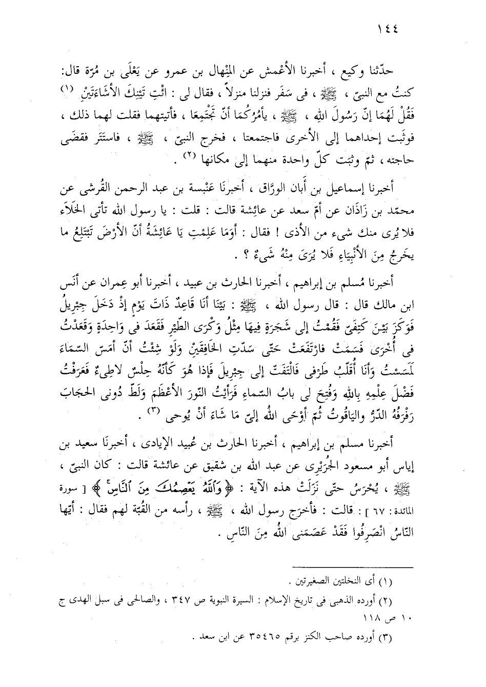 أخبرنا مسلم بن إبراهيم، أخبرنا الحارث بن عُبيد الإيادى، أخبرنَا سعيد بن إياس أبو مسعود الجُرَيْرِى عن عبد اللَّه بن شقيق عن عائشة قالت: كان النبىّ، -صلى اللَّه عليه وسلم-، يُحْرَسُ حتّى نَزَلَتْ هذه الآية: {وَاللَّهُ يَعْصِمُكَ مِنَ النَّاسِ} [سورة المائدة: ٦٧]: قالت: فأخرَج رسول اللَّه، -صلى اللَّه عليه وسلم-، رأسه من القُبّة لهم فقال: أيّها النّاسُ انْصَرِفُوا فَقَدْ عَصَمَنى اللَّهُ مِنَ النّاسِ.